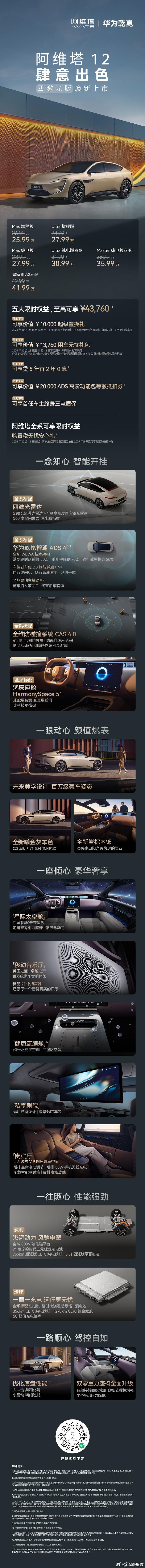 10月29日,华为靳玉志发布,阿维塔12四激光版正式上市!全系标配3颗长距激光雷达+1颗高精度固态激光雷达,带来360度全方位的安全守护!欢迎体验!