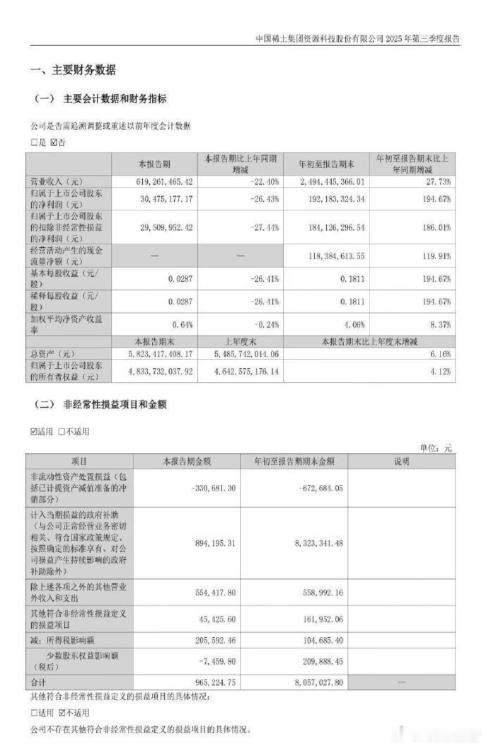 10月29日,财联社报道,中国稀土发布2025年第三季度报告,前三季度实现营业收入24.94亿元,同比增长27.73%;归属于上市公司股东的净利润为1.92亿元,同比增长194.67%。第三季度营业收入为6.19亿元,同比下降22.40%;归属于上市公司股东的净利润为3047.52万元,同比下降26.43%。业绩增长主要得益于稀土产品价格回升、公司销售结构优化。