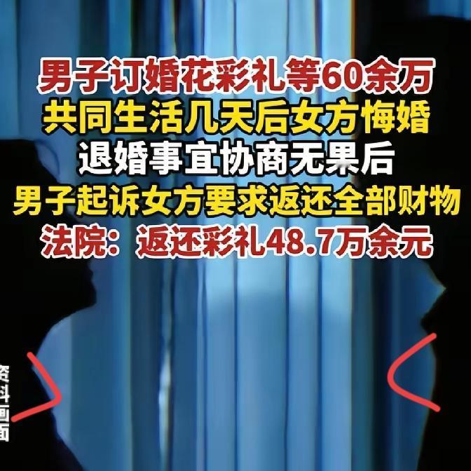 结婚才 4 天,女方就悔婚,60 万彩礼只想退一半。法院判了:退还 48.7 万。也就是说,男方为 4 天婚姻买单 11.3 万,相当于一天两万八,可真够贵的,这算是大型情景深度体验吗?女方说,谈恋爱期间开房 180 次,自己付出了很多。这话说的,好像开房是生意一样。这不是两情相悦的事嘛,又不是只有男的一个人舒服。照女方的逻辑,那些谈恋爱最后没结婚的,分手时男的都得按那啥的次数给女方付费吗?纯属无稽之谈。 情侣彩礼 八万彩礼 闪婚退彩礼 60后的彩礼 60岁结婚彩礼 退订婚礼金 婚房财产分割