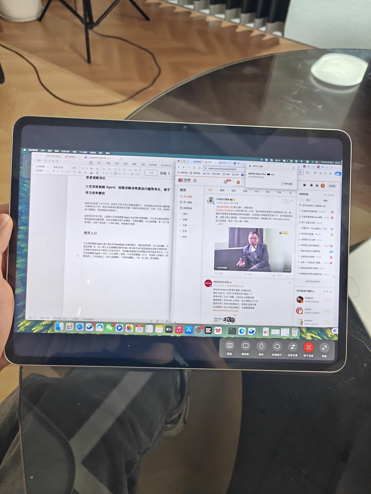 疯了,OPPO平板你要干嘛啊。。。 用了快半年才知道,OPPO Pad 4 Pro居然能远程控制Mac啊,咋没人告诉我 亏我还天天背着电脑上下班,早说这个我mac放公司不就行了。。。 试了下这个远程控制延迟还挺低的,能开虚拟键盘打字,mac的操作手势也都能用,处理一些应急工作任务完全没问题的,我只能说OPPO你无敌了,硬偷苹果家说是😂 本来想双十一再配支手写笔的,干活方便点,查了下才知道最近学生认证买平板直接送的,气死了,我为什么不是学生!