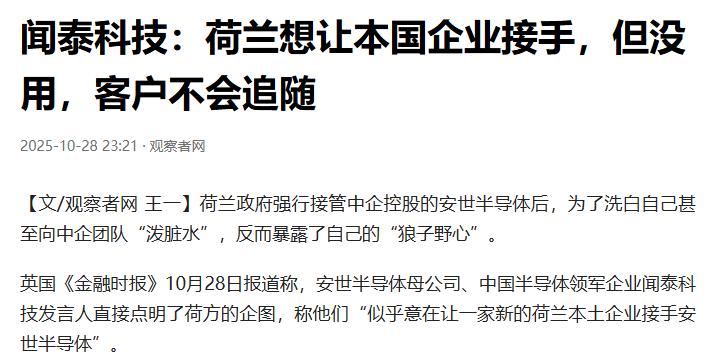 中方反击荷兰没收资产后,德国女部长恼羞成怒:北京需要被狠狠地打击一下!凯瑟琳娜·赖歇明确表示不会抗议荷兰对安世半导体的国有化,却称中方“需要被狠狠地打击一下”。显然,包括德国和荷兰在内的西方列强,还是沉浸在西方列强高高在上的陈旧思维习惯里。 闻泰科技曾斥330亿收购荷兰安世半导体,这是中国半导体最大海外收购案。中方本想共赢,却遭荷兰以“国家安全”为由,联合外籍高管、本地法庭夺控制权——中方申请延期审理被秒拒,荷兰法院文件显示,美方早要求换安世中方CEO,还设“穿透规则”扩大对中企子公司管制。 要知安世原是恩智浦边缘烂摊子,靠中方资金与中国新能源市场才盘活,2024年营收147亿元、毛利率37.47%,全球市占5.2%,细分品类常居全球出货第一。 荷兰这波操作,纯属是忘了谁给的饭吃,中方当然不能吃这个亏,反击的招儿一下就打到了要害。 安世真正的命脉,80%的芯片产能全在中国境内,中方直接宣布对安世实施出口管制,禁止特定元器件出口,还加强了稀土管控,而稀土恰恰是芯片制造的关键材料。 并且安世中国直接给所有客户发了邮件,说荷兰总部散布不实信息,自己要独立运营,而且以后供货只收人民币。 这一下就把荷兰抢来的总部变成了空壳子,除了几个高管和一堆文件,啥实际控制权都没有。 要知道,全球86%的企业都从安世中国的生产基地采购芯片,宝马、大众这些欧洲车企更是离不了它的货,有些芯片根本找不到替代品,安世一断供,欧洲汽车生产线就得停摆。 荷兰本以为抢了公司能拿捏别人,结果到手没几天就发现,没有中国的产能和技术,自己手里的安世连货都出不了,之前保住的上千个就业岗位眼看就要没了,每年能收的税收也跟着缩水,这买卖算下来血亏。 这时候德国女部长凯瑟琳娜·赖歇跳出来喊“要狠狠地打击中方”,还说不抗议荷兰的国有化,纯属是没算清自家的账。德国汽车工业协会早就发了警告,安世断供可能导致“生产大规模停滞”,大众汽车自己都承认工厂很快就要停工了。 要知道大众早就直接从安世这类半导体厂商手里采购芯片,就是为了稳住供应链,现在安世出了问题,首当其冲受影响的就是它。 德国制造业本来就靠着汽车产业撑着,这供应链一断,可不是少赚点钱的事,是成千上万人的饭碗要出问题。 之前乌克兰就干过一模一样的蠢事,当年中国天骄集团要收购马达西奇,都快成了结果乌克兰在美国撺掇下撕毁合同,把公司国有化,还冻结了中方资金。 最后中方直接告到海牙仲裁,要赔45亿美元,虽然乌克兰现在没钱赔,但它经济本来就差,失去中企投资后更是雪上加霜,成了欧洲最穷的国家之一。 荷兰现在走的就是乌克兰的老路,只不过摊子更大,牵扯的产业链更广。没过多久荷兰就撑不住了,经济大臣主动给中国商务部部长打电话,说要找“建设性方案”,欧盟也急着下场调和,贸易委员专门跟中方视频会谈,说愿意帮着沟通,本质上就是26个欧盟国家一起求中方高抬贵手。 毕竟谁也不想跟着荷兰一起倒霉,汽车产业停摆的代价,没有哪个欧洲国家扛得住。 荷兰抢来的不过是个空壳子,没有中国产能支撑,客户跑光了,上千员工的饭碗悬了,每年少缴的税收都是实打实的损失,这哪是捡宝贝,分明是抱了个烧红的烙铁。 德国跟着瞎嚷嚷,最后只会让自己的制造业买单,等大众的生产线真停了,汽车工人的抗议声传到赖歇耳朵里,她恐怕就不会喊着“打击中方”,而是得催着荷兰赶紧把资产还回去换供应链稳定了。 这种还把自己当“列强”的陈旧思维,在全球化的今天早就行不通了。 现在的产业链是你中有我、我中有你,安世的案子已经说明,靠抢靠压的老套路,最后烧到的只会是自己的一亩三分地。 商业合作讲的是契约精神,不是谁拳头硬谁说了算,毕竟现在的世界,谁也离不开谁的供应链,砸别人的碗,最终只会破了自己的锅。