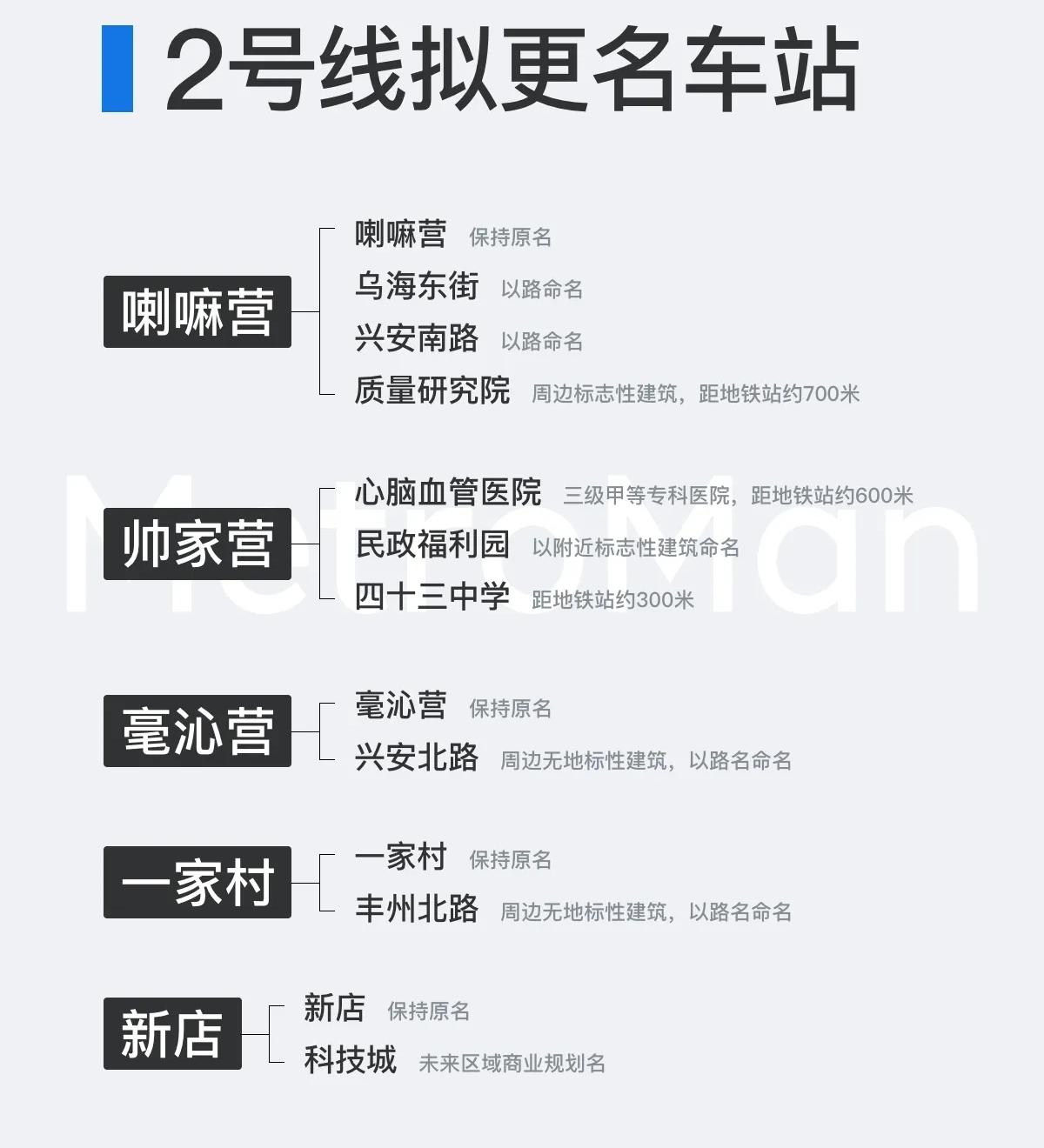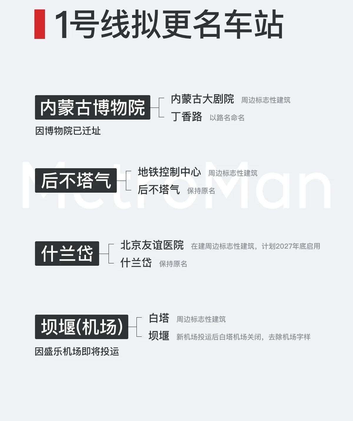 呼和浩特地铁九座车站拟更名! 此次更名的车站有内蒙古博物院站、后不塔气站、什兰岱站、坝堰(机场)站、喇嘛营站、帅家营站、毫沁营站、一家村站、新店站! 早在2023年就有站点更名过,像地铁2号线“新城图书馆”站成了“北山公园”站,是因为北山公园是当地更具标志性的地点。 “东二环路”站改为“丝绸之路大道”站是由于该站位于成吉思汗大街与丝绸之路大道交叉口西侧,且东二环路已更名为丝绸之路大道! 每个站点的更名都是为了让市民和游客,更清晰地识别站点位置,同时更好地传承城市历史文化!大家还觉得以上哪些车站有更名的必要?欢迎在评论区留下你的想法! 温馨提示:普通市民也可前往“青橙融媒”投票,选出最佳站点名,还能在“自定义建议”框贡献“金点子”。截止日期是2025年10月31日24:00!
