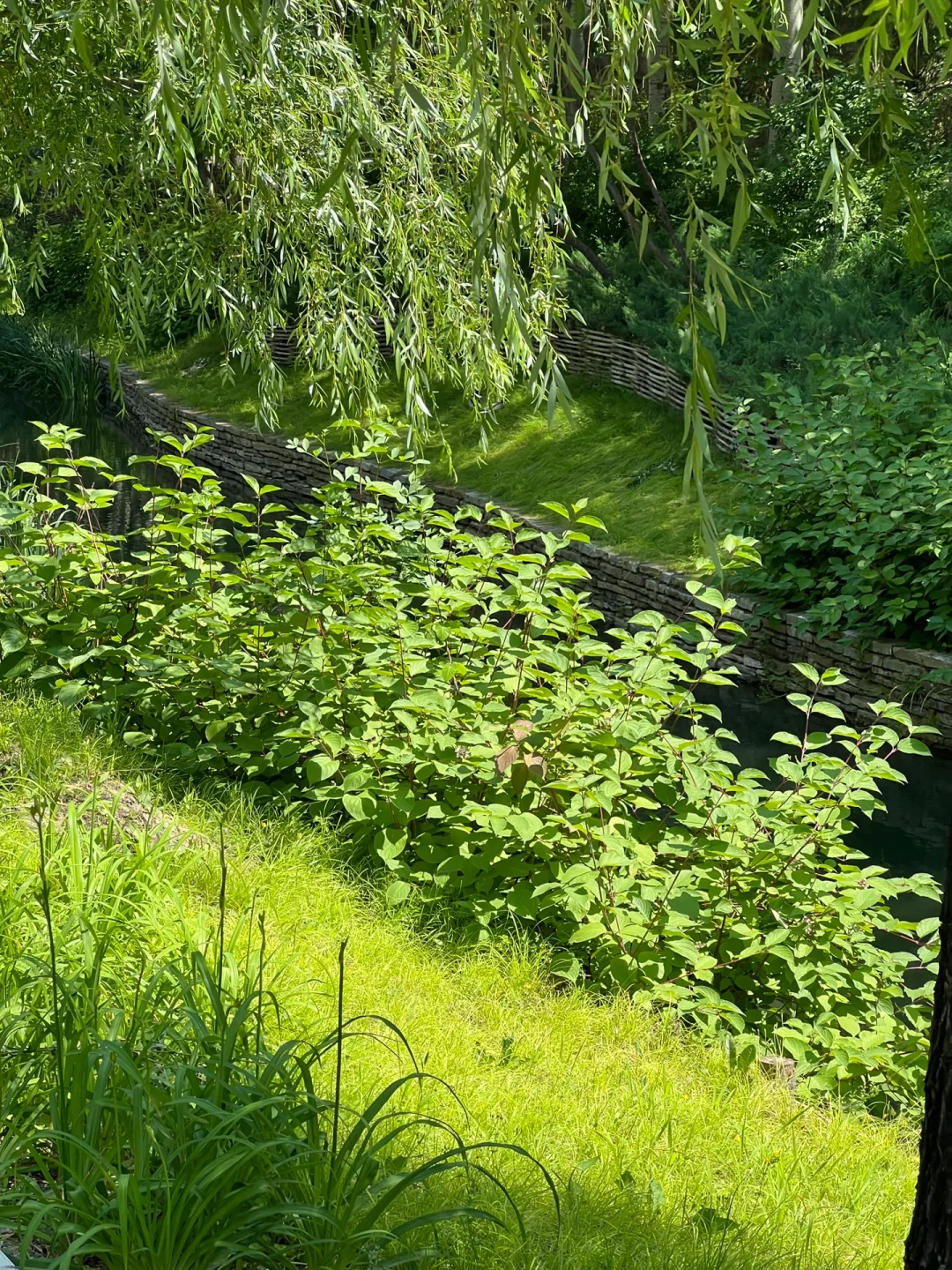 画面层次➡️溪水、小瀑布、拱桥和上方的树丛…