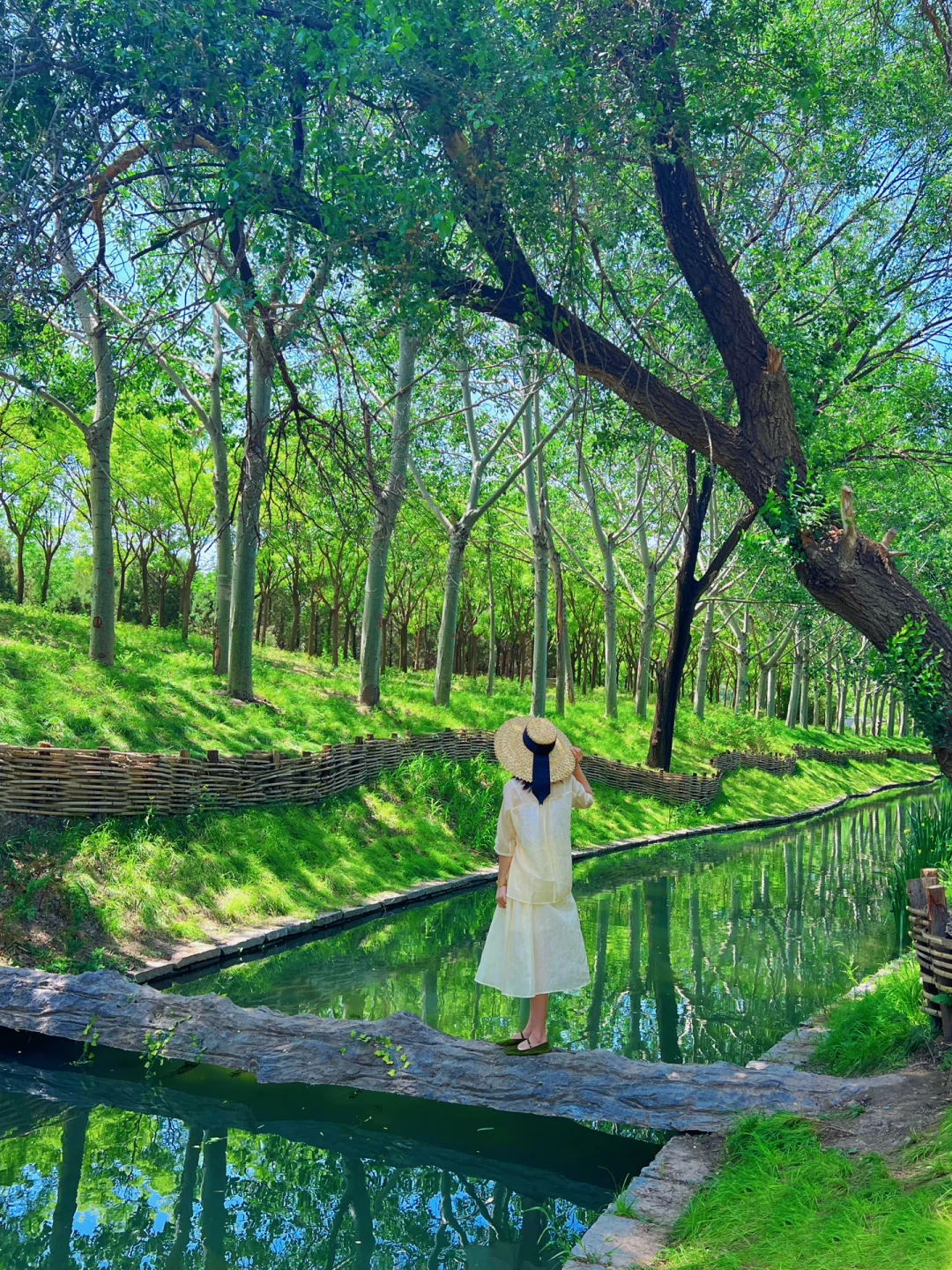 画面层次➡️倒影、木桥、人、曲折的溪水、郁郁葱葱的树…
