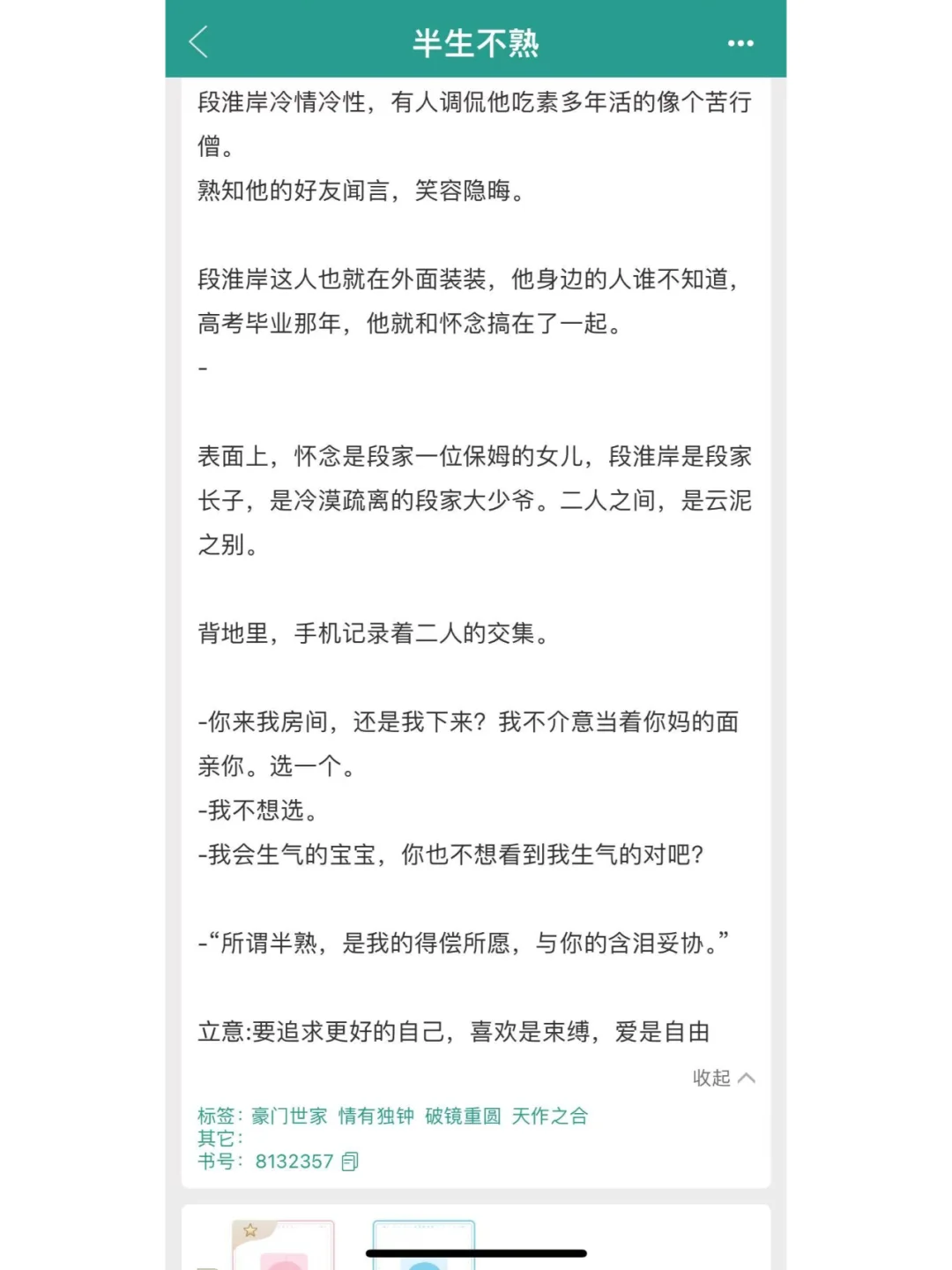 《半生不熟》,作者:慕吱 主角:怀念,段淮岸 *坚韧独立 x 冷漠疏离 *温柔冷静 x 强势黏糊 *现言/豪门世家/情有独钟/破镜重圆/天作之合 ——————分割线—————— 作者大大把故事设定为一个“人前不熟,人后猛亲”的小甜饼故事。女主妈妈是男主家的保姆,但是女主跟男主一直到高中才产生交集。女主本身的性格就是独立坚韧,又温柔包容,所以在跟男主的相处中,一直是不卑不亢,看似跟男主有社会地位差,但其实在感情中女主才是主导。 男主家很有钱,本人有才有貌,但性格却冷清冷性,当然这是对别人,在面对女主的时候,男主非常强势黏人,而且男主很早就暗恋女主了,后面两人在一起之后的相处非常有张力,超绝拉扯感。 两人一开始交往,是处于“地下情”的阶段,别人都不知道两人在恋爱,这个设定暗戳戳的,但读起来却很有张力及拉扯感。但两人在这段感情中最大的拉扯就是自由与束缚,追求与妥协该如何平衡。两人在这段感情中有无奈,有妥协,有甜蜜,有挣扎,但还在作者大大给了一个圆满的答案,最终主角们在这个故事里完成了自我成长,实现了双向奔赴。 小说 现言 暗恋 暗恋文 破镜重圆 破镜重圆文 拉扯感 性张力