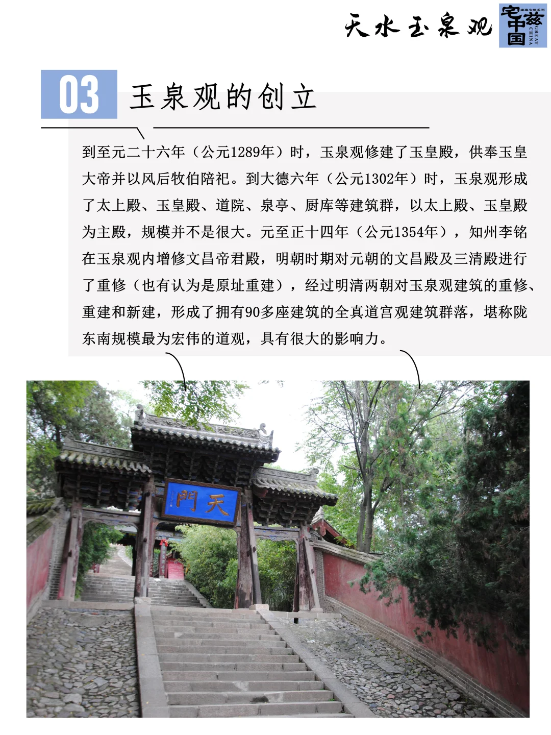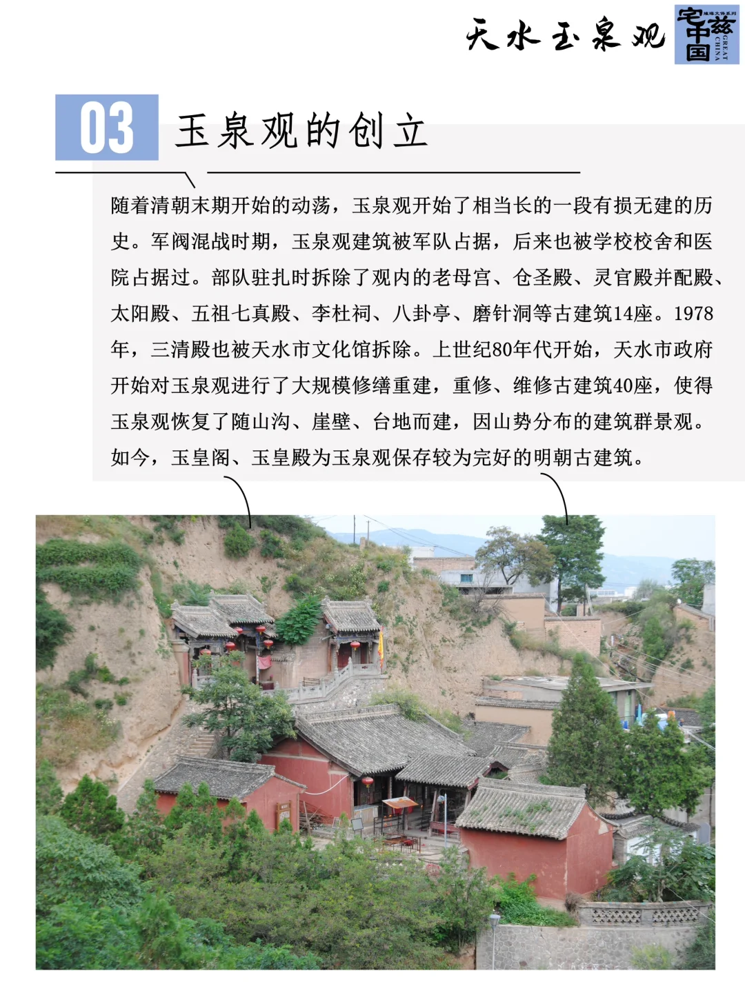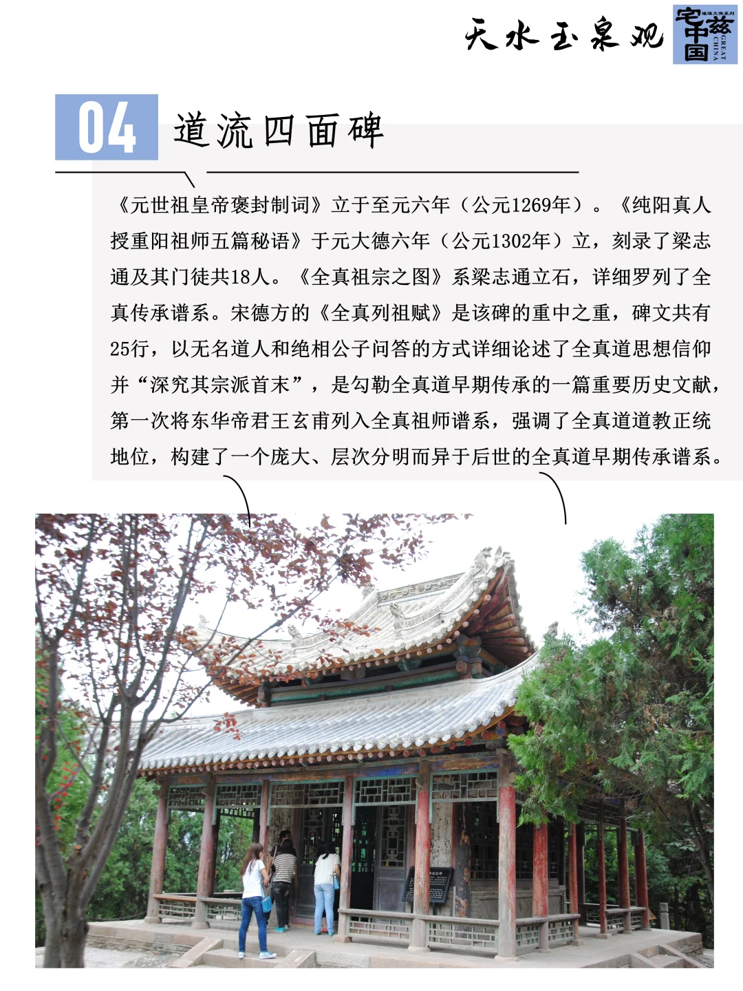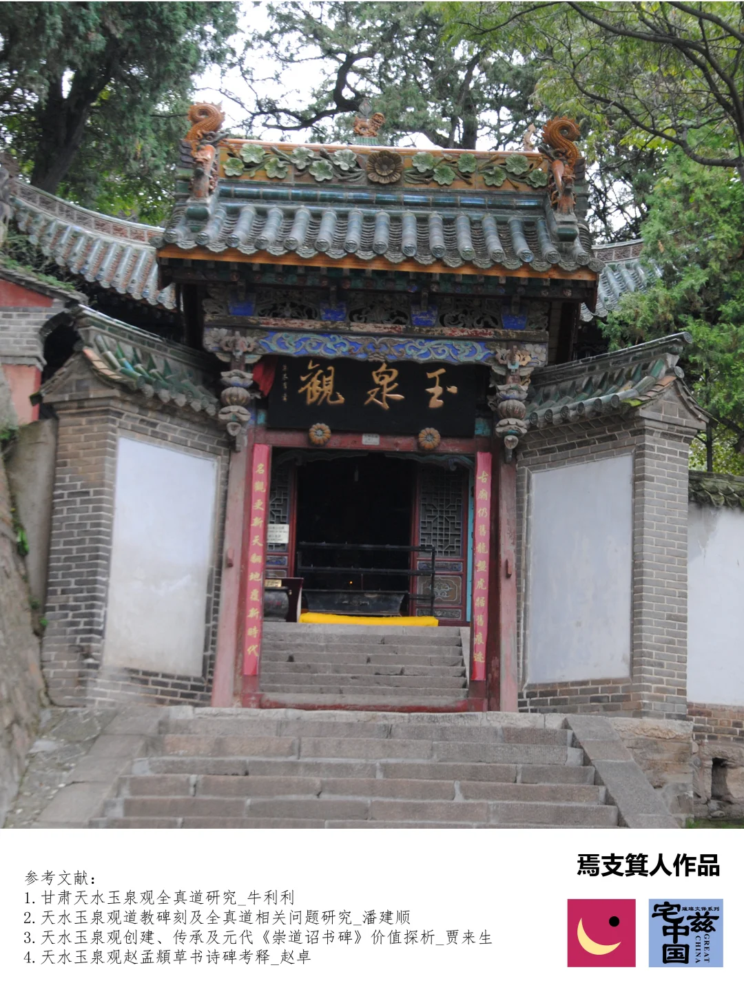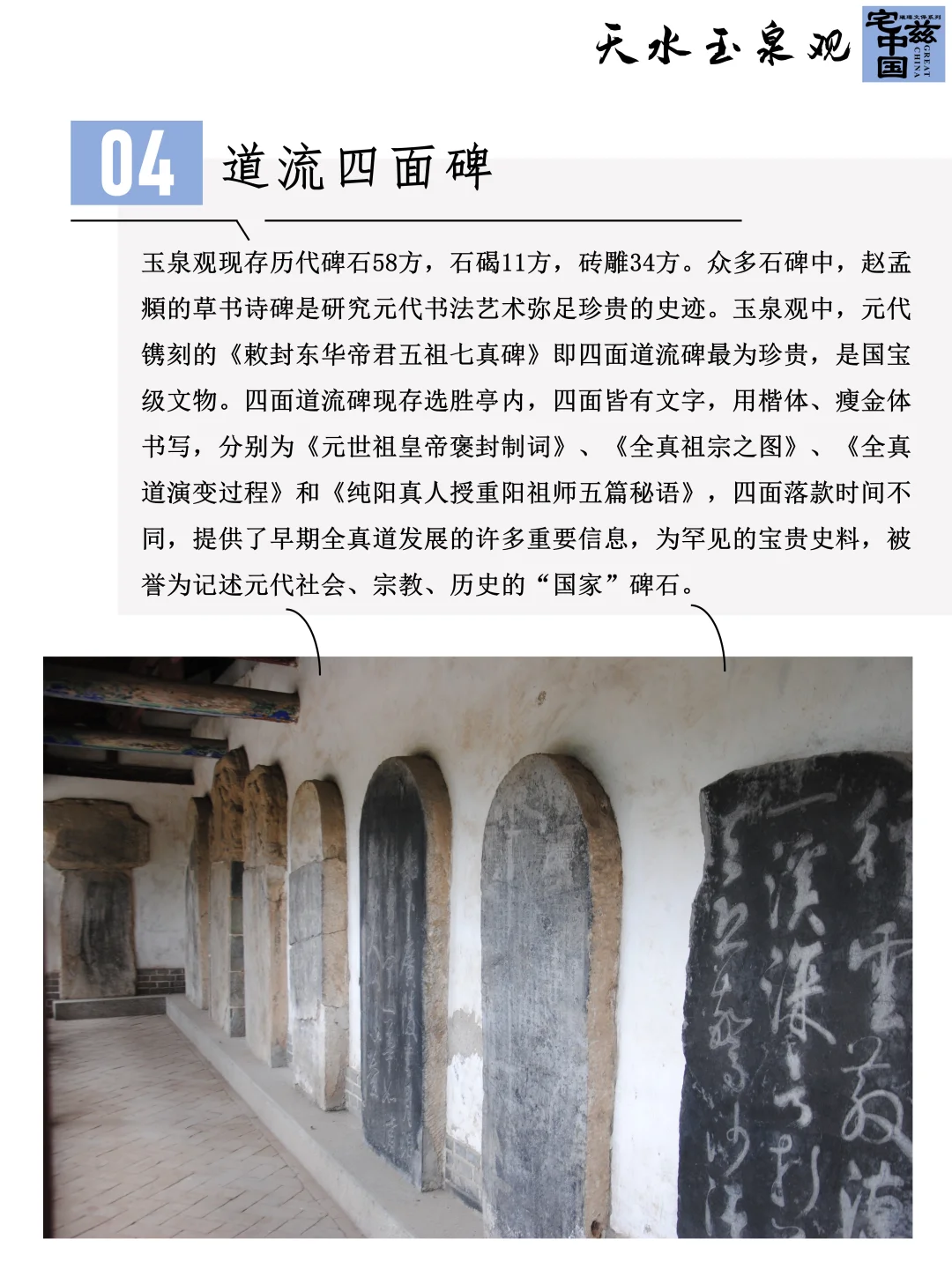 玉泉观为元至元八年丘处机徒裔梁志通追慕仙真遗迹来到天水天靖山修道时所建,经过元明清三代的努力,成为了拥有九十多座建筑的著名全真道宫观建筑群。玉泉观中的《敕封东华帝君五祖七真碑》即四面道流碑最是国宝级罕见文物,被誉为记述元代社会、宗教、历史的“国家”碑石,价值巨大。玉泉观中还保存有赵孟頫的草书诗碑。