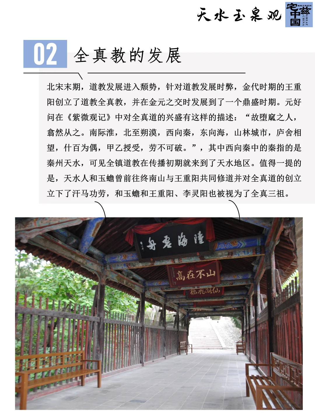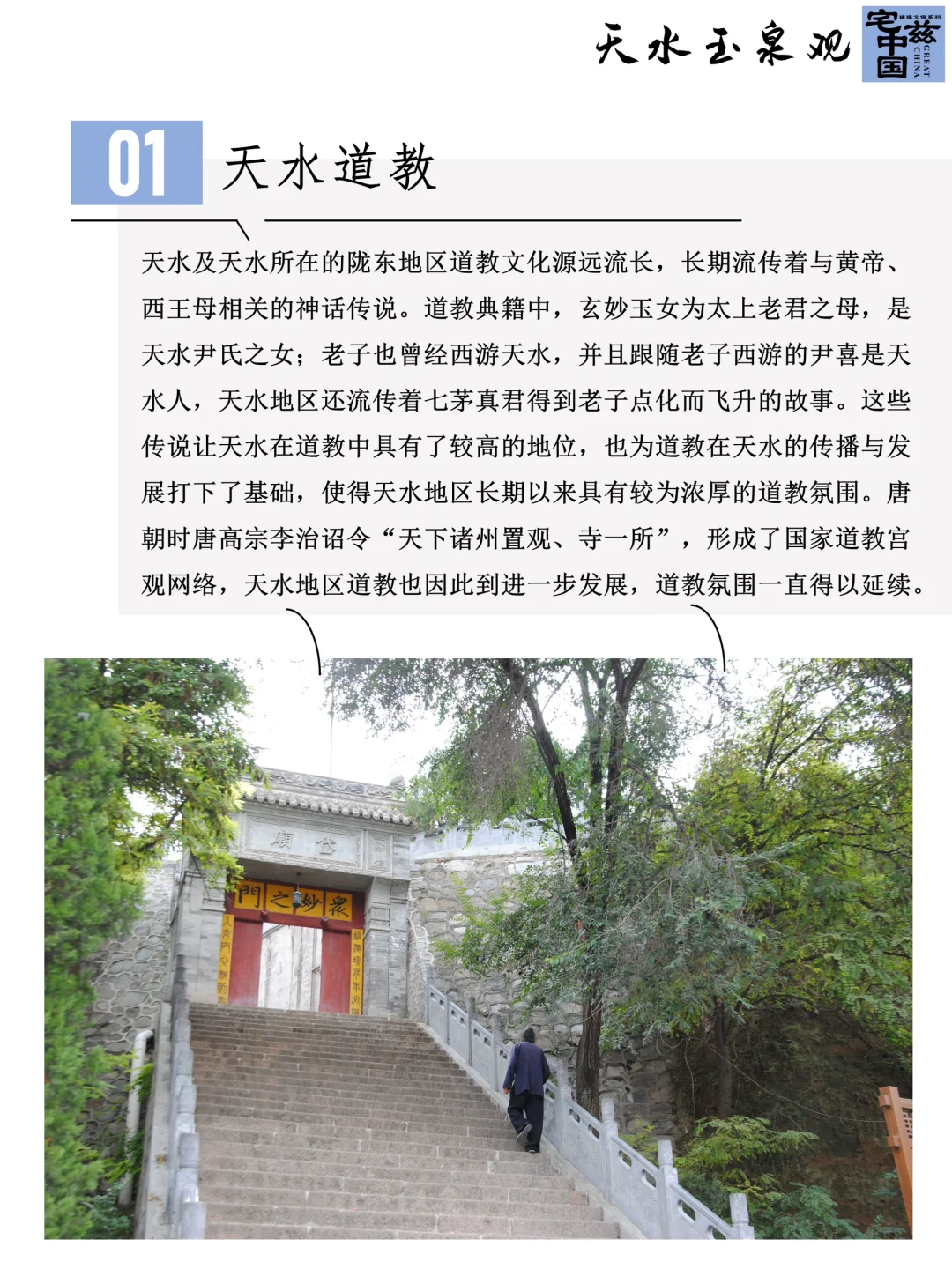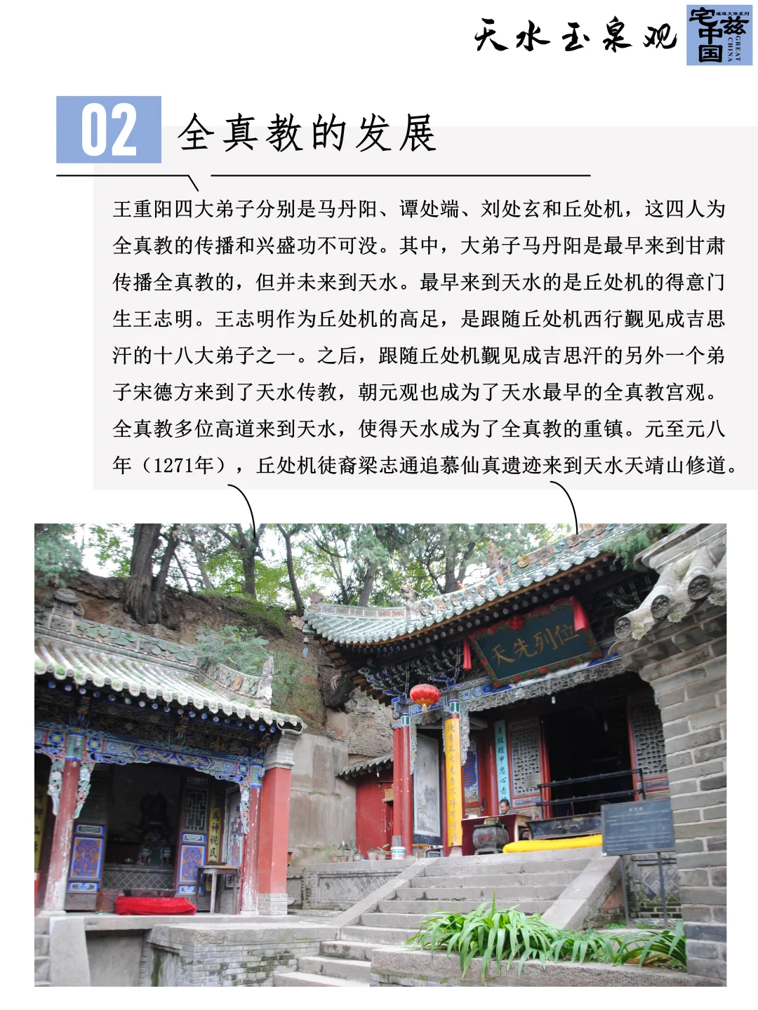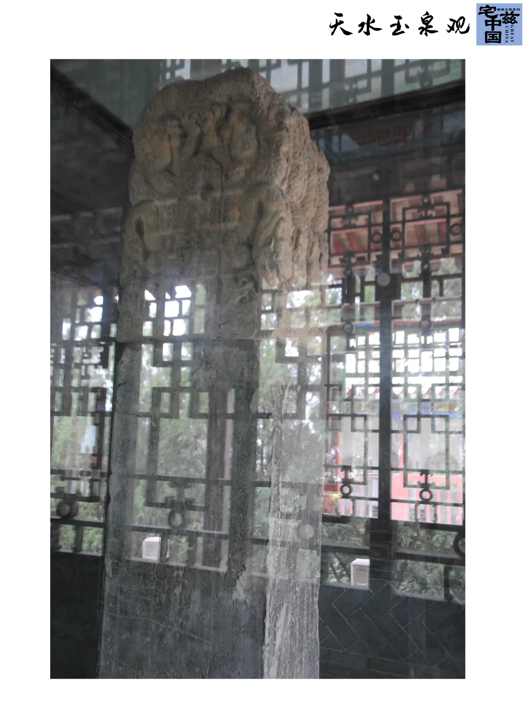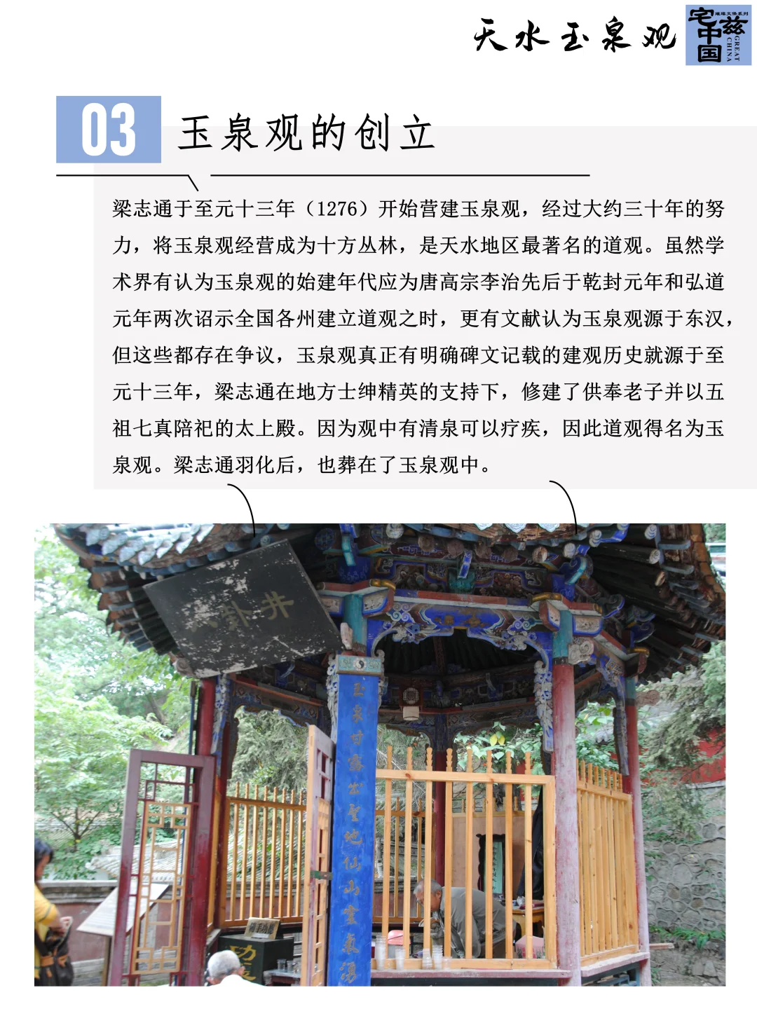 玉泉观为元至元八年丘处机徒裔梁志通追慕仙真遗迹来到天水天靖山修道时所建,经过元明清三代的努力,成为了拥有九十多座建筑的著名全真道宫观建筑群。玉泉观中的《敕封东华帝君五祖七真碑》即四面道流碑最是国宝级罕见文物,被誉为记述元代社会、宗教、历史的“国家”碑石,价值巨大。玉泉观中还保存有赵孟頫的草书诗碑。