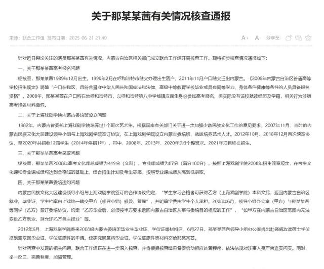 还有最近频上热搜的“委培姐”那尔那茜,虽然现在经过调查组核查,证明之前网传的她高考分数为179分是谣传,她实际高考分数文化课总成绩为449分,不过,调查证实,那尔那茜确实涉嫌高考报名材料造假(明明是在北京读的高中,却以呼和浩特八中的应届生身份参加高考报名)。