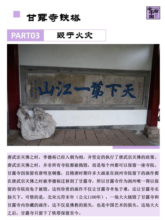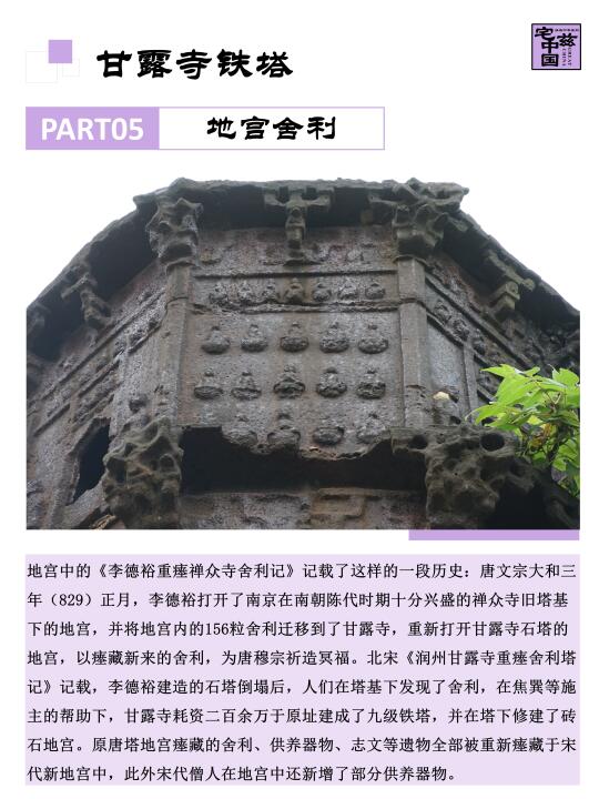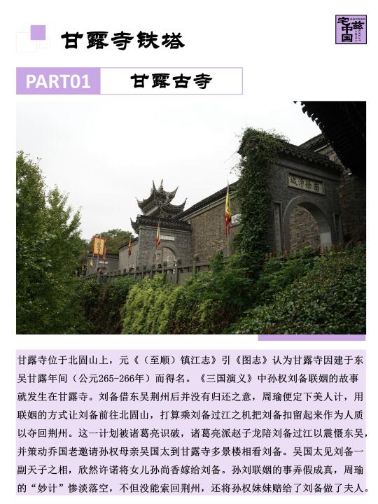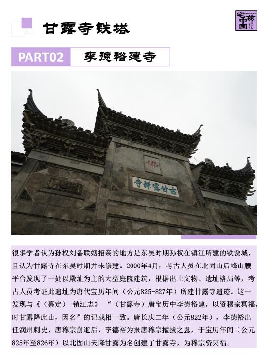《三国演义》中刘备孙权曾在甘露寺联姻,但三国时期甘露寺并未修建。根据史料及出土文物判断,甘露寺始建于唐宝历年间,是李德裕为报唐穆宗擢拔之恩,以北固山天降甘露为名创建了甘露寺,以为穆宗资冥福。甘露寺毁于北宋时期的大火,寺内铁铸阁楼式宝塔幸存,塔下地宫瘗藏有李德裕从南京长干寺和禅众寺迁移而来的舍利子。