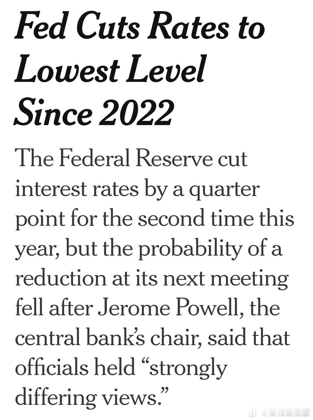 美联储降息0.25%,今年第二次,已是2022年以来最低点