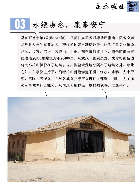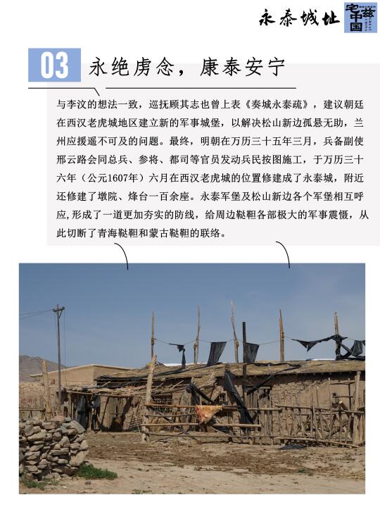 隆庆和议结束了明朝与蒙古近二百年的敌对状态,但是由于大小松山地区地处蒙古鞑靼和青海鞑靼的联络线上,蒙古多次攻占此地,万历年间松山之战后,为了加强防御,修建了松山新边墙并在沿线屯兵修建军事堡垒,永泰城址就是当时重要的军事要塞。公元1607年,永泰城在西汉老虎城要塞的位置修建而成,并一直沿用至今未被荒废。
