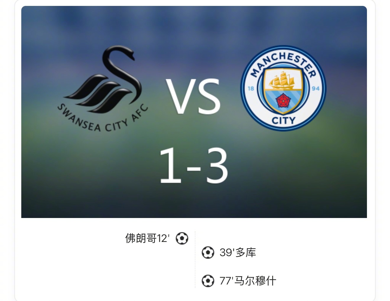 【战报:斯旺西1比3曼城,多库扳平,马尔穆什制胜】上半场弗朗哥破门打破僵局;多库折射扳平。下半场马尔穆什爆射破门;切尔基传射建功。