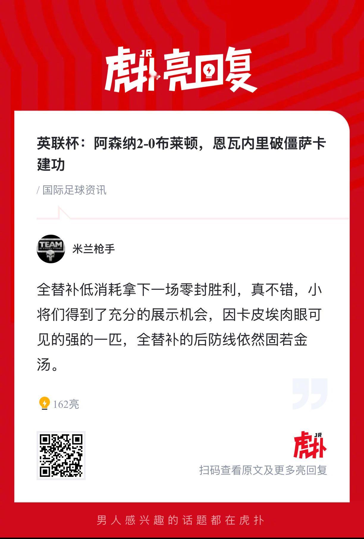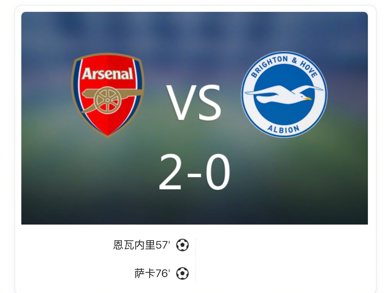 【英联杯:阿森纳2比0布莱顿,恩瓦内里破僵萨卡建功】上半场双方互交白卷。下半场恩瓦内里、萨卡接连破门。