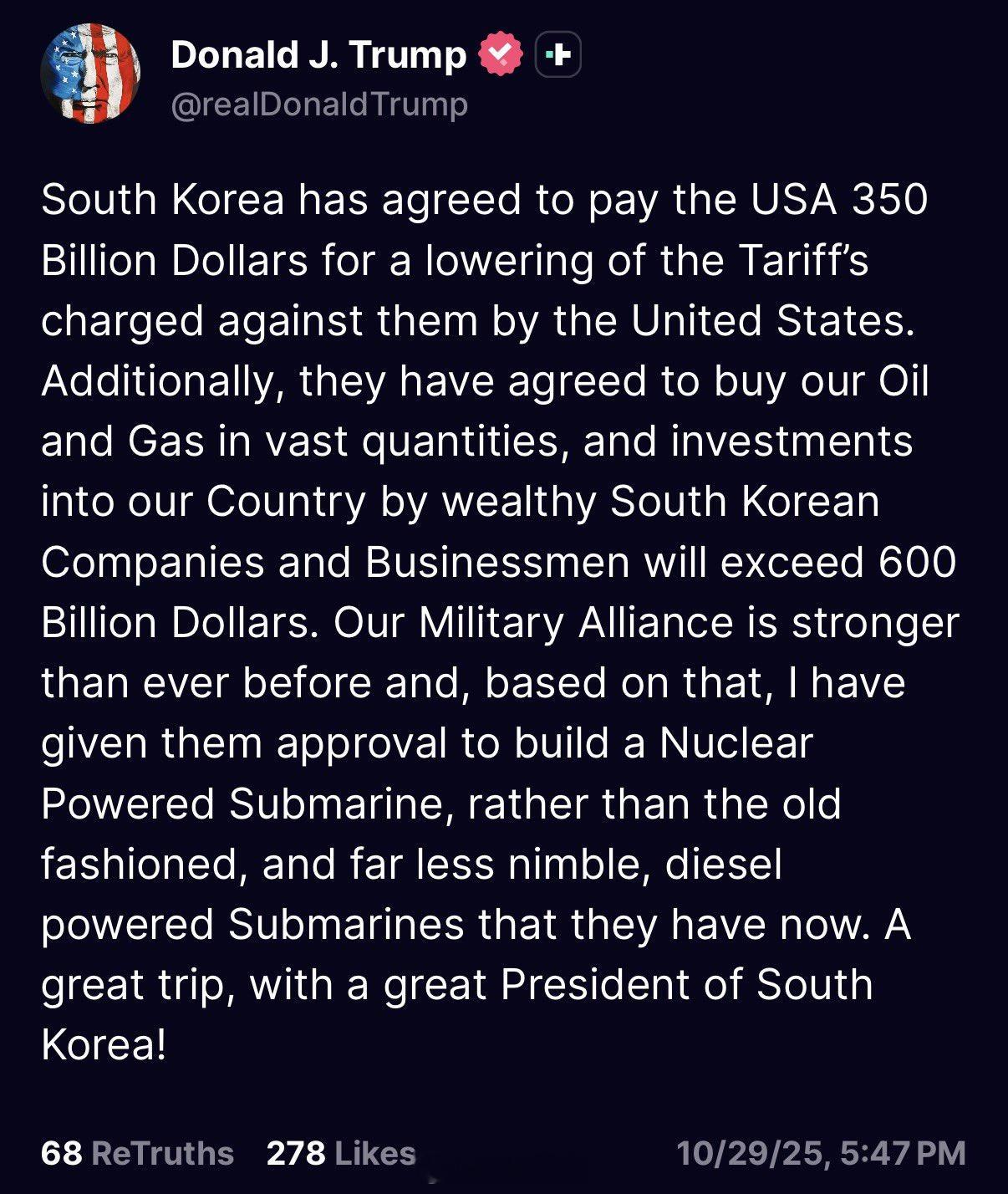 川普还表示,韩国已同意大量购买美国石油和天然气,其对美投资将超过6000亿美元。