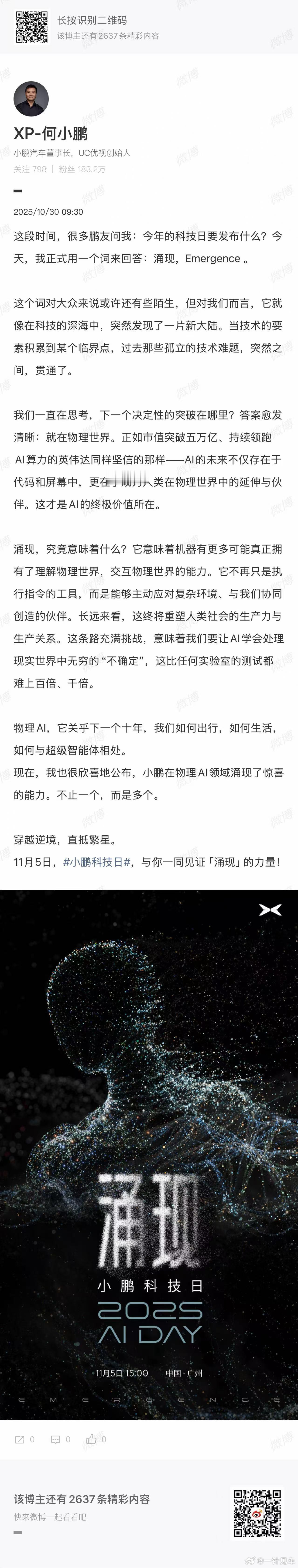 小鹏科技日定档11月5日本届科技日的主题是「涌现Emergence」,11月5日,小鹏广州新总部见!物理AI,它关乎下一个十年,我们如何出行,如何生活,如何与超级智能体相处。