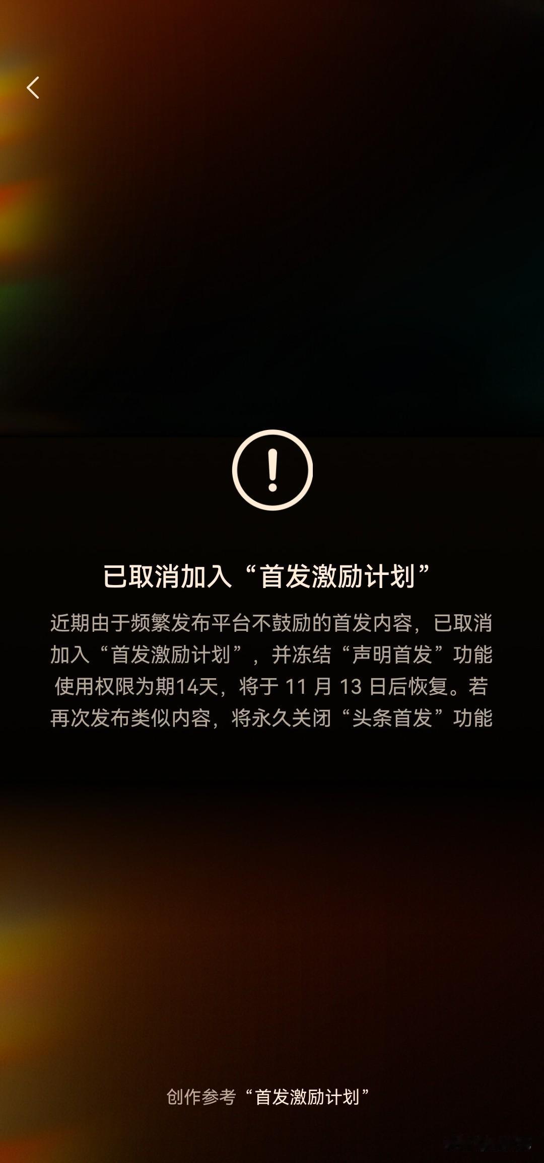 不要太自信了,不是所有的文章都能选择首发声明的。 我就因为默认首发,被关小黑屋了。 前几天有几条展现阅读都比较高的文字,我自己也知道,那就是娱乐调侃性质,但是有流量,所以多发了一些类似的。 今天收到首发激励取消的信息了,说是发了平台不鼓励的首发内容。[捂脸] 所以,条友们,慎重声明首发,教训啊!!! 不过也奇怪,不鼓励的内容,展现还挺好[捂脸]
