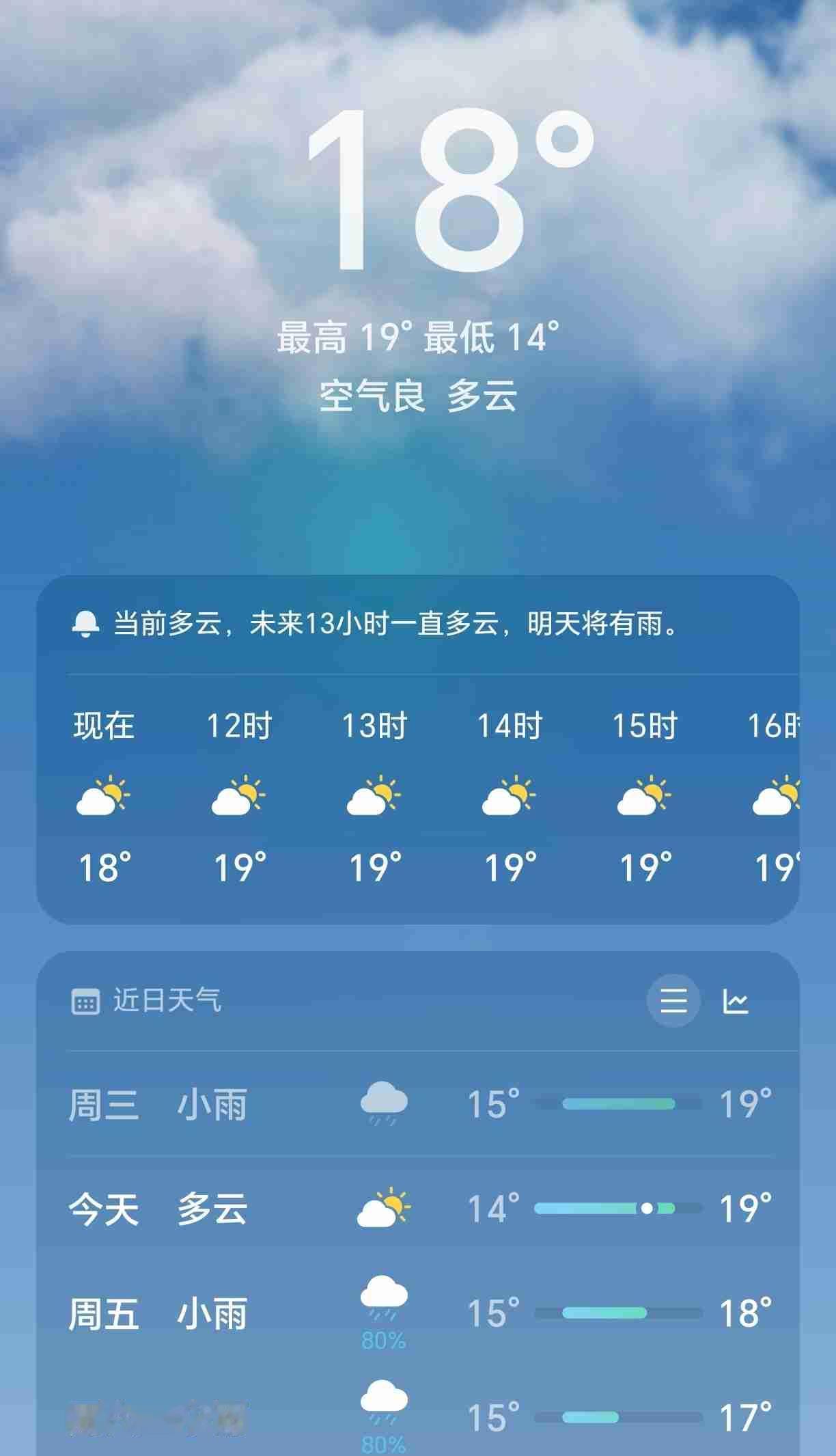 今天没有下雨了,晴天,最高温度19度,最低温度14度。 我的今日状态:💪🏻