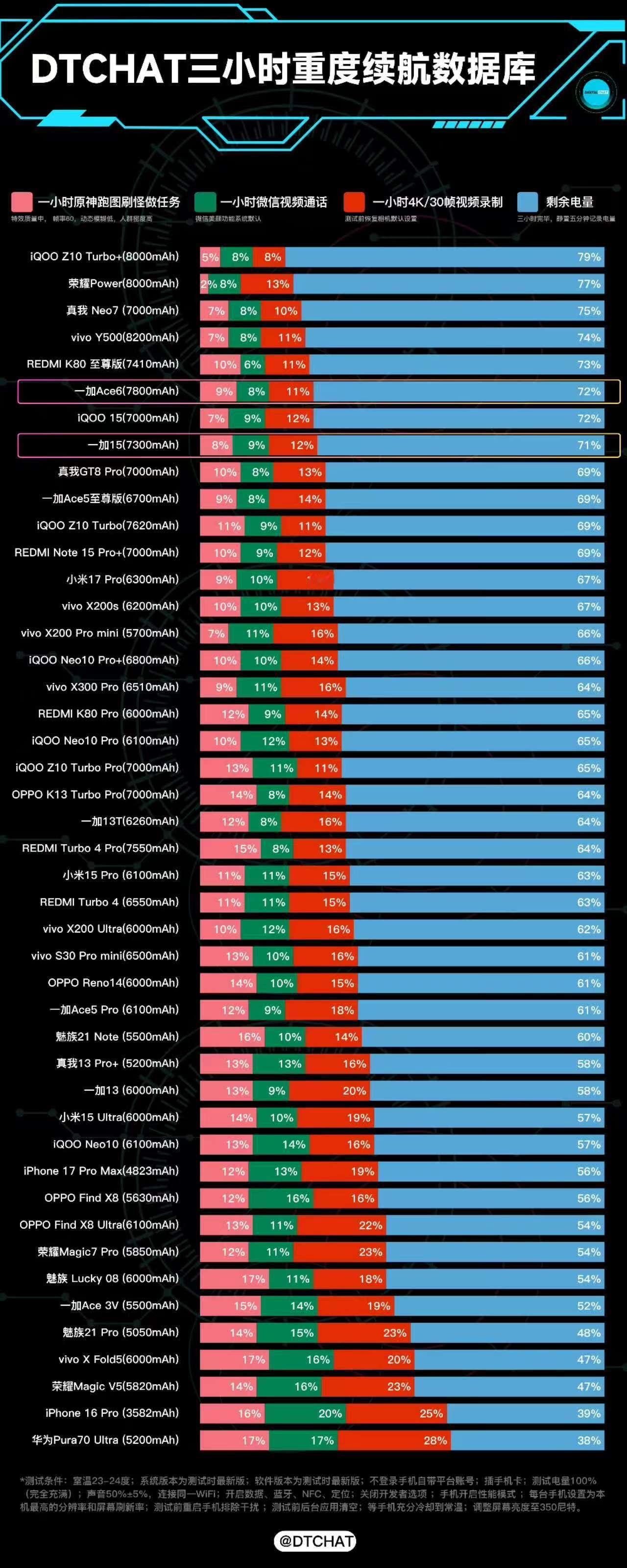 7800mAh大电池彻底告别续航焦虑,我们在DTCHAT三小时重度续航测试下一加Ace6剩余电量72%,排名相当靠前,加上120W 闪充回血速度也够快,通勤间隙充个电就够用一下午了。最意外是手感,这么大的电池机身重量只有213g,整体握持感很不错。