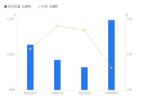 10月30日消息,数据显示,截至2025年9月30日,*ST元成A股股东总户数为1.26万户,较上期(2025年6月30日)增加2401户,增幅23.65%。公司最新A股总股本为3.26亿股,其中流通A股3.26亿股,户均持有流通A股数量为2.59万股,较上期减少6135.9股,降幅19.13%;户均持流通A股市值4.67万元,较上期减少6.59万元,降幅58.53%。