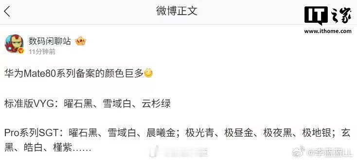 华为Mate80系列颜色曝光