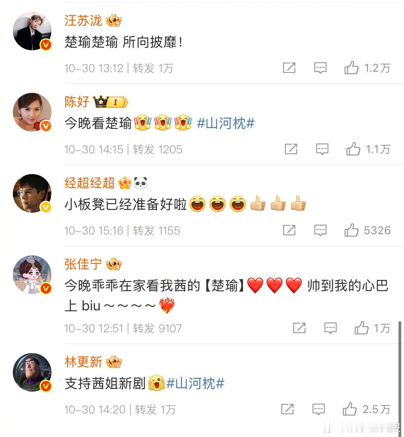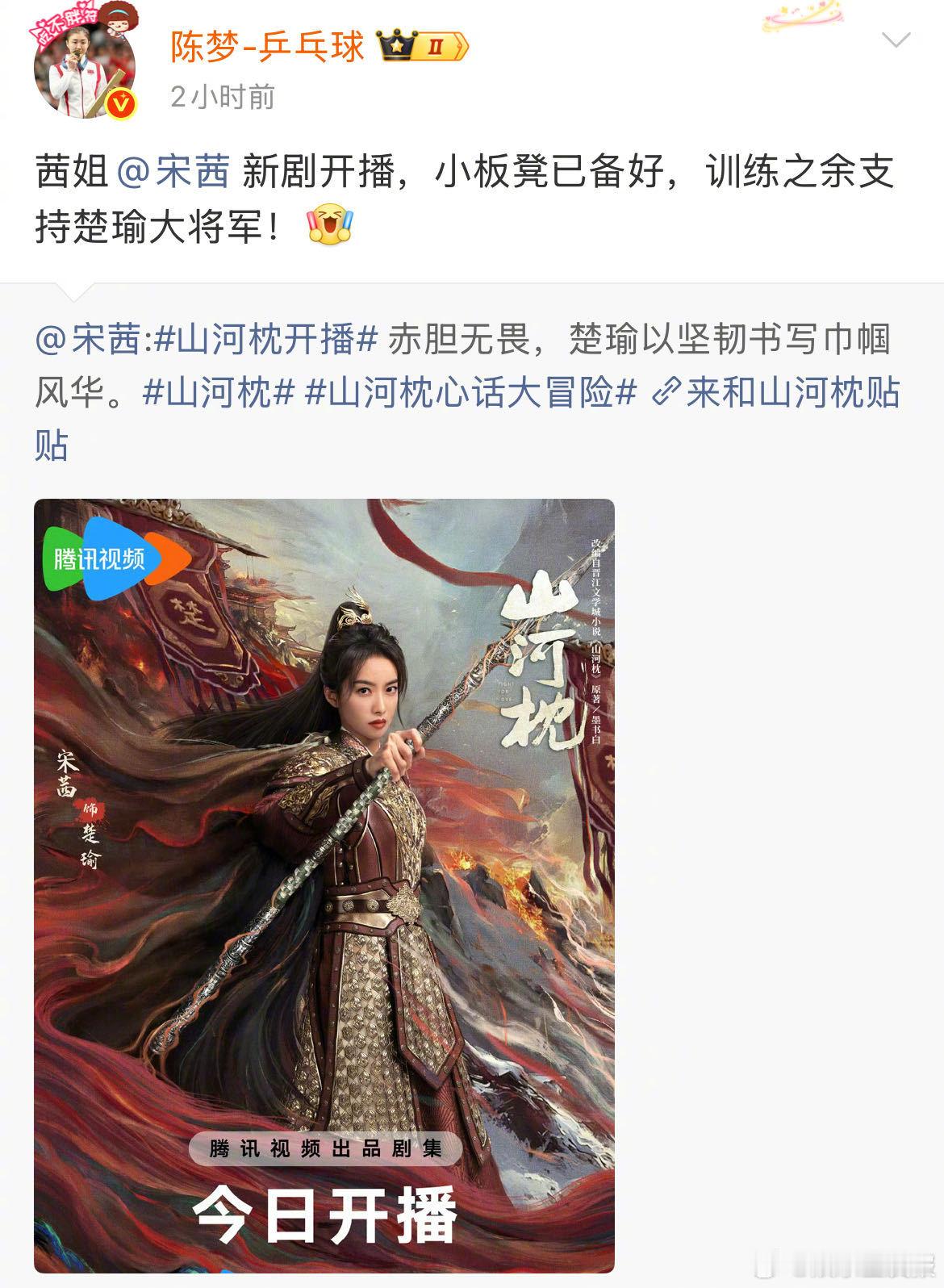 宋茜微博转发区 哇新剧山河枕今日开播, 楚瑜摇了好多人啊,很多合作过的好伙伴,甚至奥运冠军陈梦都来了!姐这神奇的交际圈,戏里戏外都是团宠,今晚必看清单,等着开播!