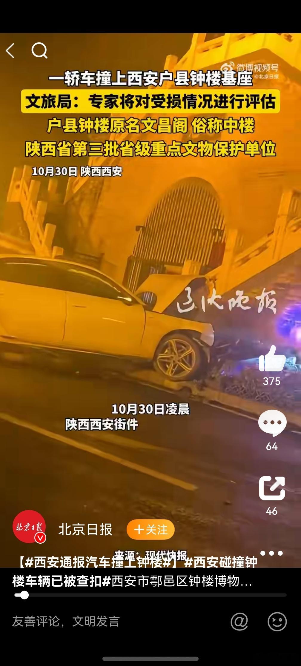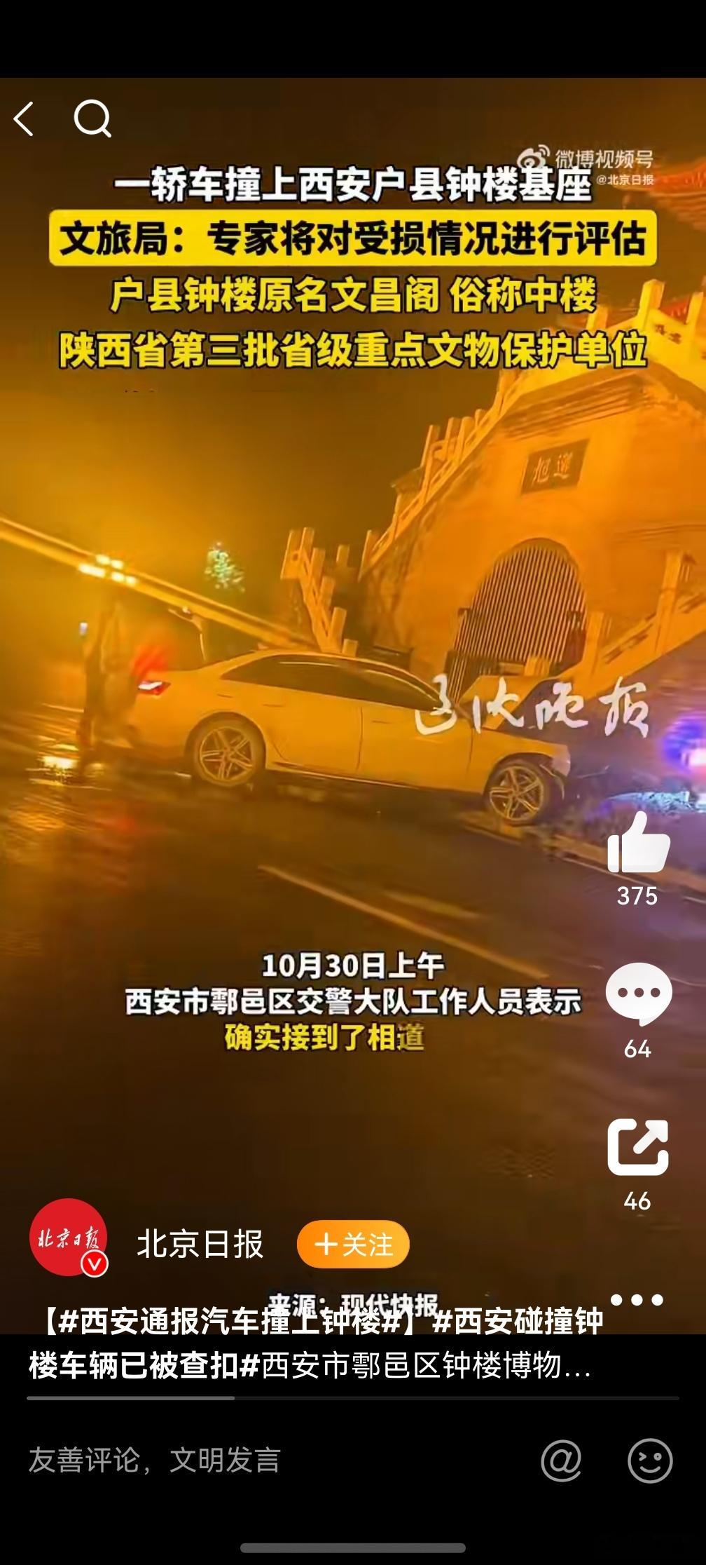 西安通报汽车撞上钟楼,第一眼看到这个话题,我以为是搞笑的或者是谐音梗的事情,没想到竟然是真的新闻,这也太离谱了。[捂嘴哭]