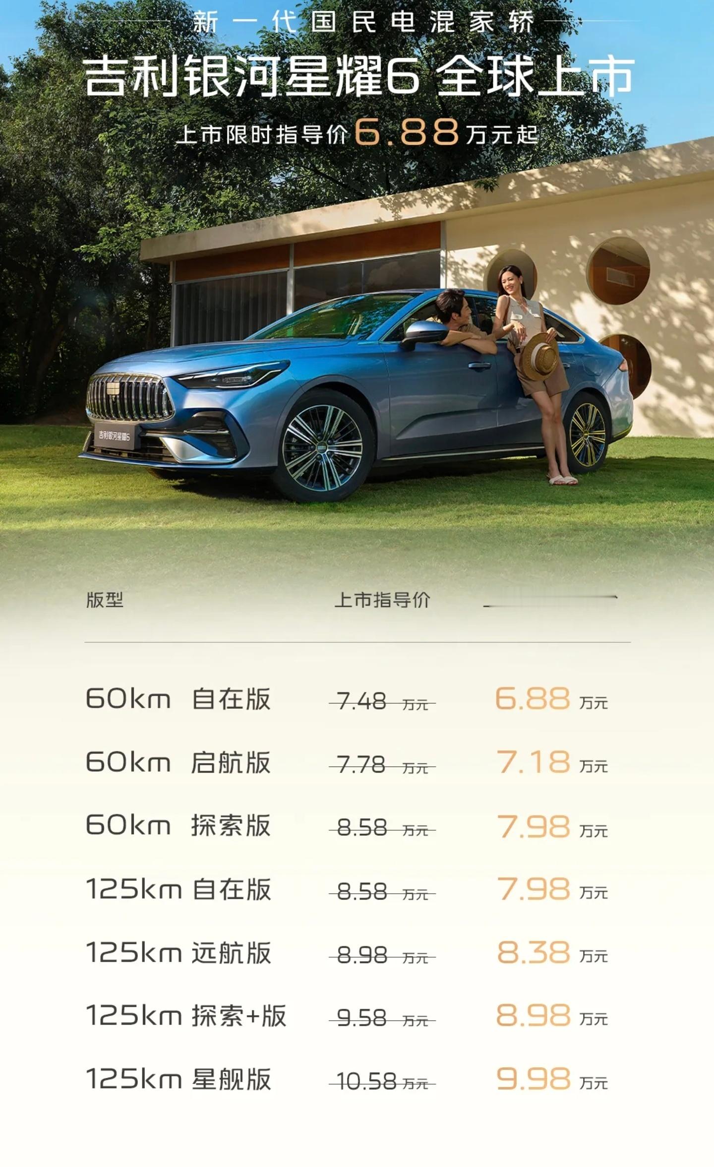 吉利银河星耀6是真把老百姓的需求摸得透透的!限时指导价——吉利银河星耀6限时指导价6.88万元起这不就是直接把新一代国民电混家轿的门槛踹到了地板上,这诚意谁看了不心动?