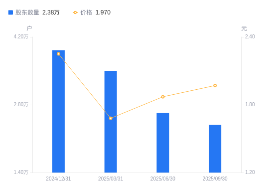 近一年(2024年9月30日至2025年9月30日),*ST阳光A股股东户数从2.85万户,减低至2.38万户,降幅16.40%,区间股价下跌13.60%。