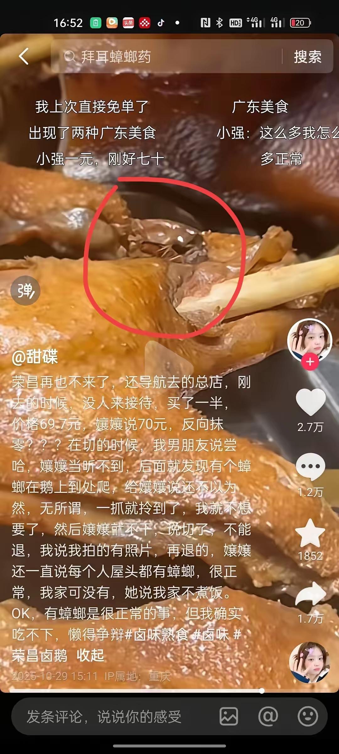 荣昌卤鹅果然还是出事了,根据一位叫做甜碟抖音博主爆料说:她从重庆导航到荣昌去的什么卤鹅总店,结果到那里没人理睬,她就有点不悦了,等了大半天,然后那店主大妈才有空,小美女说要买一半卤鹅,称出来的价格是69.7元,结果被大妈反向抹零说要70,在切的时候小美女的男友说要尝一下,但那大妈就当没听见,结果神奇的一幕出现了,一只小强在卤鹅上爬来爬去,结果大妈看见了也不以为然,也无所谓,一抓就完事,小美女看到这一幕,顿时就惊掉了下巴,她直接表示不想要了,结果大妈还不干了,她说都切了,不能退,且态度强硬,她还说哪个人的家里都有小强,有小强是正常的!整个过程被小美女发到了网上,引来很多网友的围观,纷纷被这大妈的言行所折服,荣昌卤鹅在几个月前那可是妥妥的流量体,没想到仅隔几个月,问题出现一大堆,差评的人越来越多,小作坊,半路出家的人来做,借着流量就想捞一票的人比比皆是,要知道当有只小强能在众目睽睽出现的时候,说明在店里的小角落,它们已经无处不在了,这些大妈没有经过任何培训,没有任何卫生意识,甚至没有做过生意,可想而之,让这种人继续做卤鹅,流量的反噬只会越来越快! 那只在卤鹅上悠闲散步的蟑螂,分明就是行业乱象的缩影。去年某餐饮协会的调查报告显示,网红美食店的平均生命周期只有11个月,其中超过60%的店铺因卫生问题被投诉。反向抹零的七毛钱,暴露的是某些商家对消费者的傲慢,仿佛顾客的体验还不如一枚硬币重要。 蟑螂爬过的卤鹅继续售卖,这种操作简直突破底线。食品卫生安全法明确规定,经营腐败变质的食品最高可处十万元罚款。大妈那句“谁家没蟑螂”的辩解,把家庭卫生标准与商业食品安全混为一谈,荒唐得让人瞠目。 流量狂欢背后是品控的全面溃败。三个月前还刷屏的荣昌卤鹅,如今在社交平台涌现大量差评。有消费者反映某些店铺改用冷冻鹅替代现卤,还有人称买到的卤鹅散发着酸味。这些案例都在印证同一个规律:没有品质支撑的流量,注定是昙花一现。 那些临时入局的经营者根本不懂老字号的份量。据说当地正宗卤鹅需要经过六道工序,光香料就要十八种。而现在某些店铺连基本卫生都做不到,却打着传统招牌招摇撞骗。这种急功近利的做法,正在摧毁几代人积累的美食信誉。 市场监管部门该出手了。去年某省开展网红食品专项整治,下架问题产品三千余件。对于荣昌卤鹅这样的地域名片,更需要建立严格准入机制。建议消费者选择明厨亮灶的店铺,购买时注意查看食品经营许可证。 流量从来不是护身符,品质才是长生牌。杭州某百年老店每天限量供应,坚持现做现卖反而成了网红。真正的美食文化需要慢火熬制,那些想走捷径的经营者,最终只会被市场淘汰。 各位读者你们怎么看?欢迎在评论区讨论。