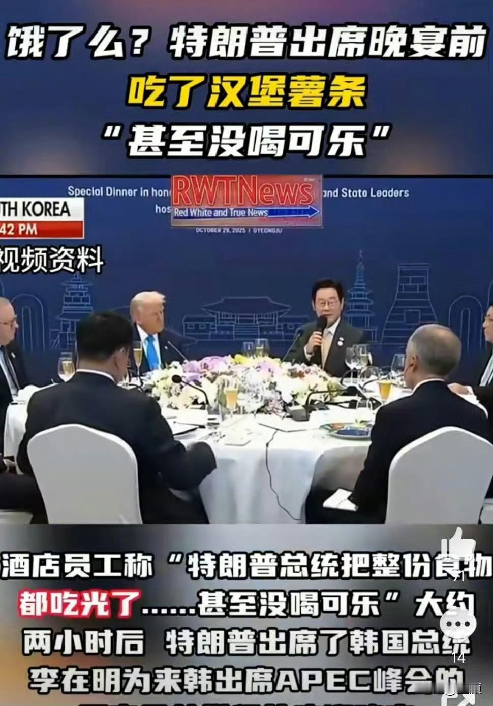 没吃饱,特朗普回到宾馆就加餐。特朗普在韩期间下榻的庆州希尔顿酒店员工30日透露,特朗普抵达位于希尔顿酒店8楼的客房后,第一件事就是点了客房服务要求提供芝士汉堡,并要求额外增加美式芝士,强调多给番茄酱。 酒店一名员工表示,特朗普没有点可乐,但将芝士汉堡、炸薯条和番茄酱一扫而空,看上去十分满意,并主动提出要和酒店员工合影。 李在明招待特朗普的午餐很简单,一碗米饭,五种菜,一碗汤,基本上每样菜都是只有两块。