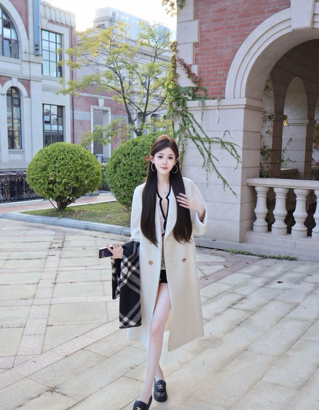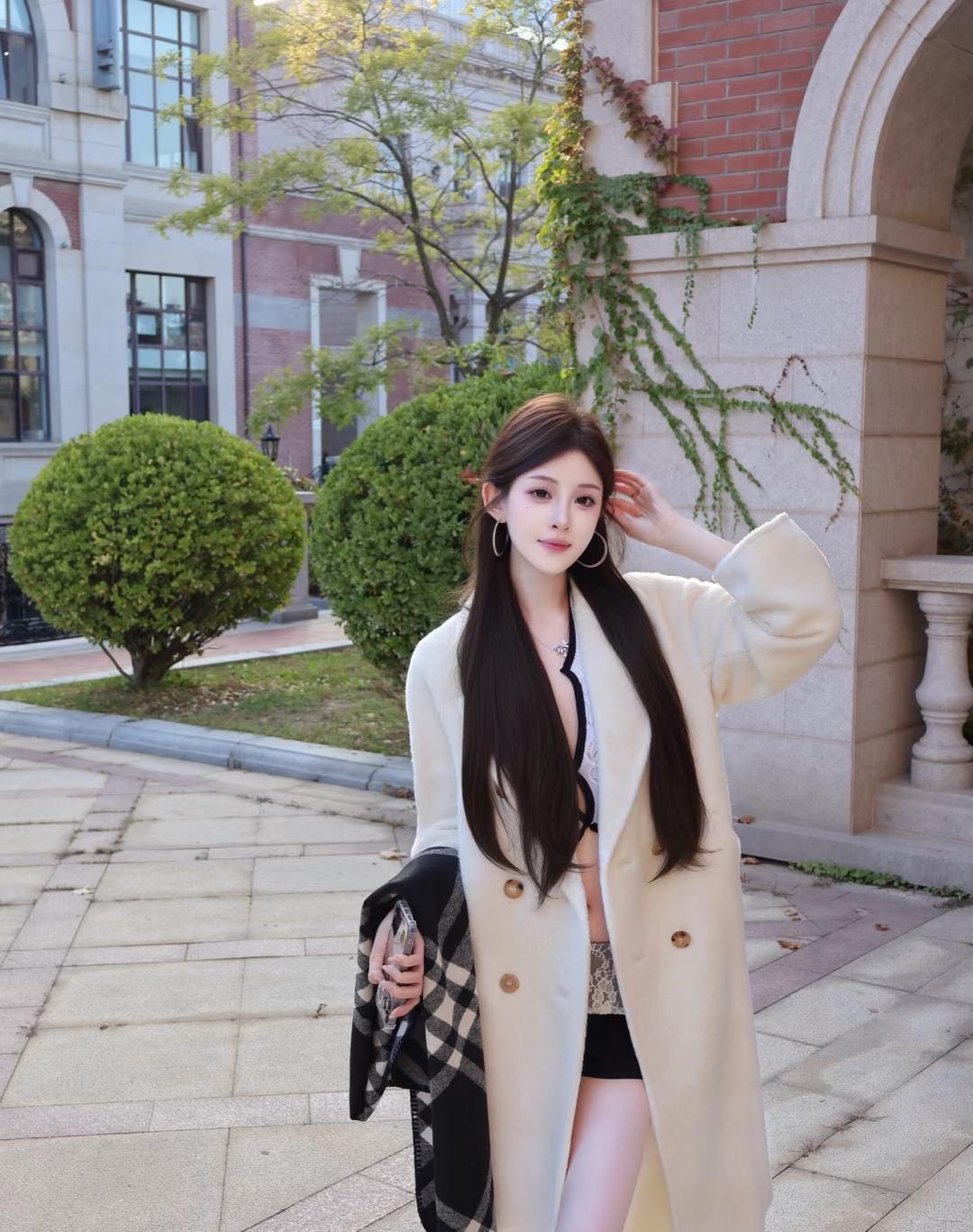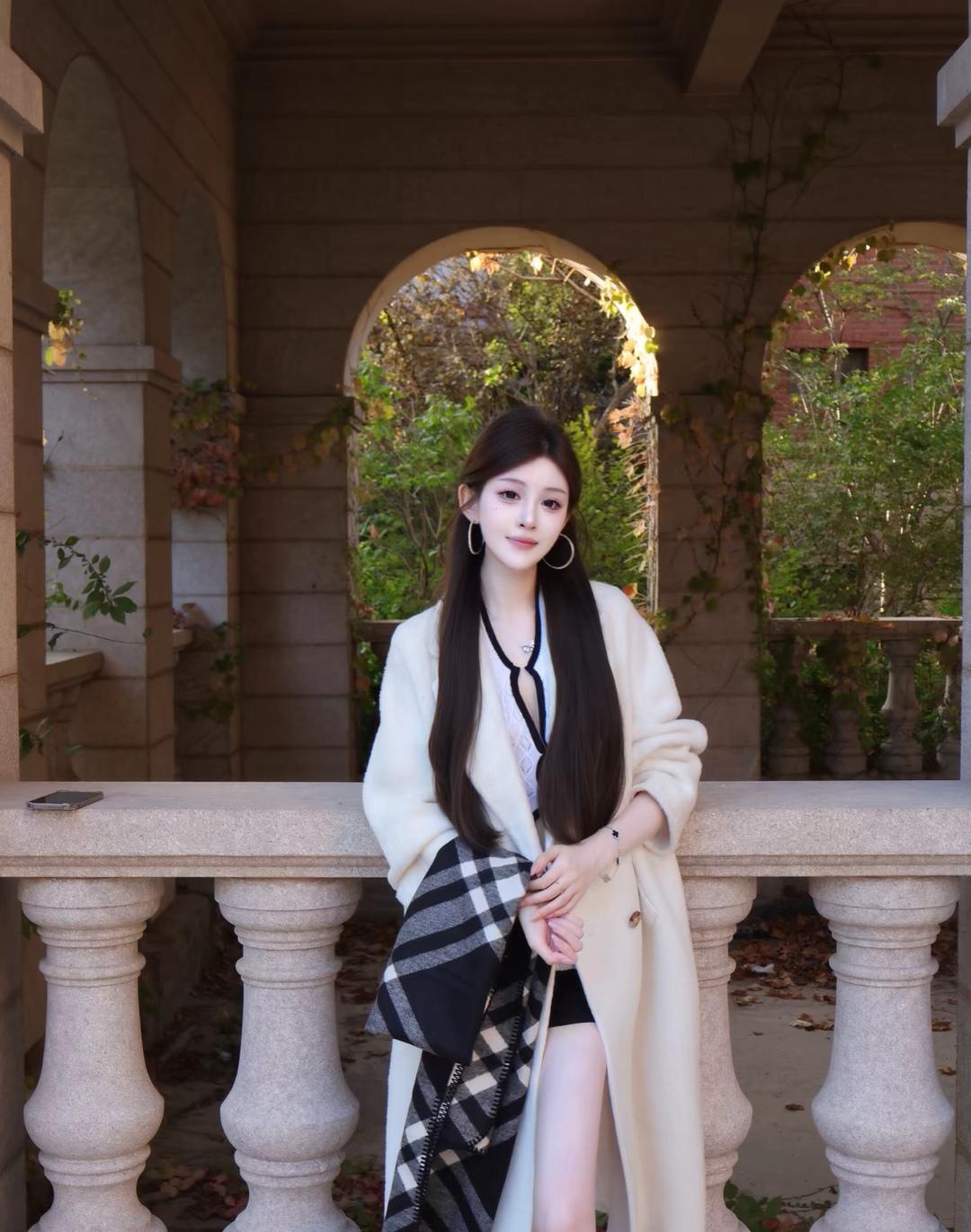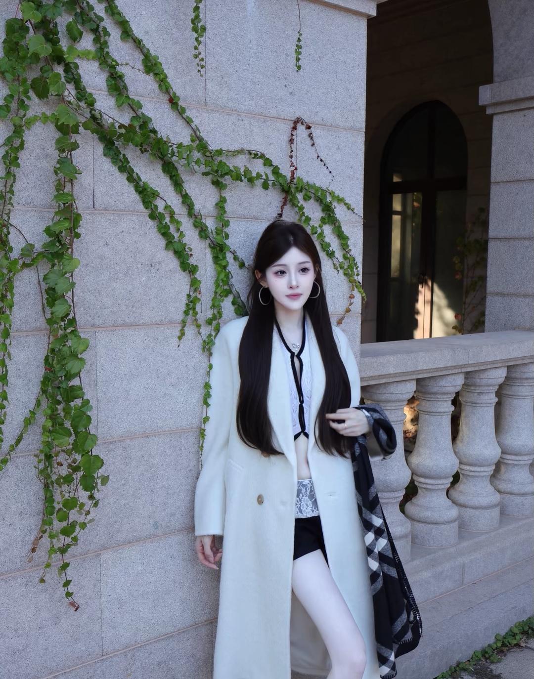 优雅白衣少女,倚靠石墙,绿植环绕,复古风十足。