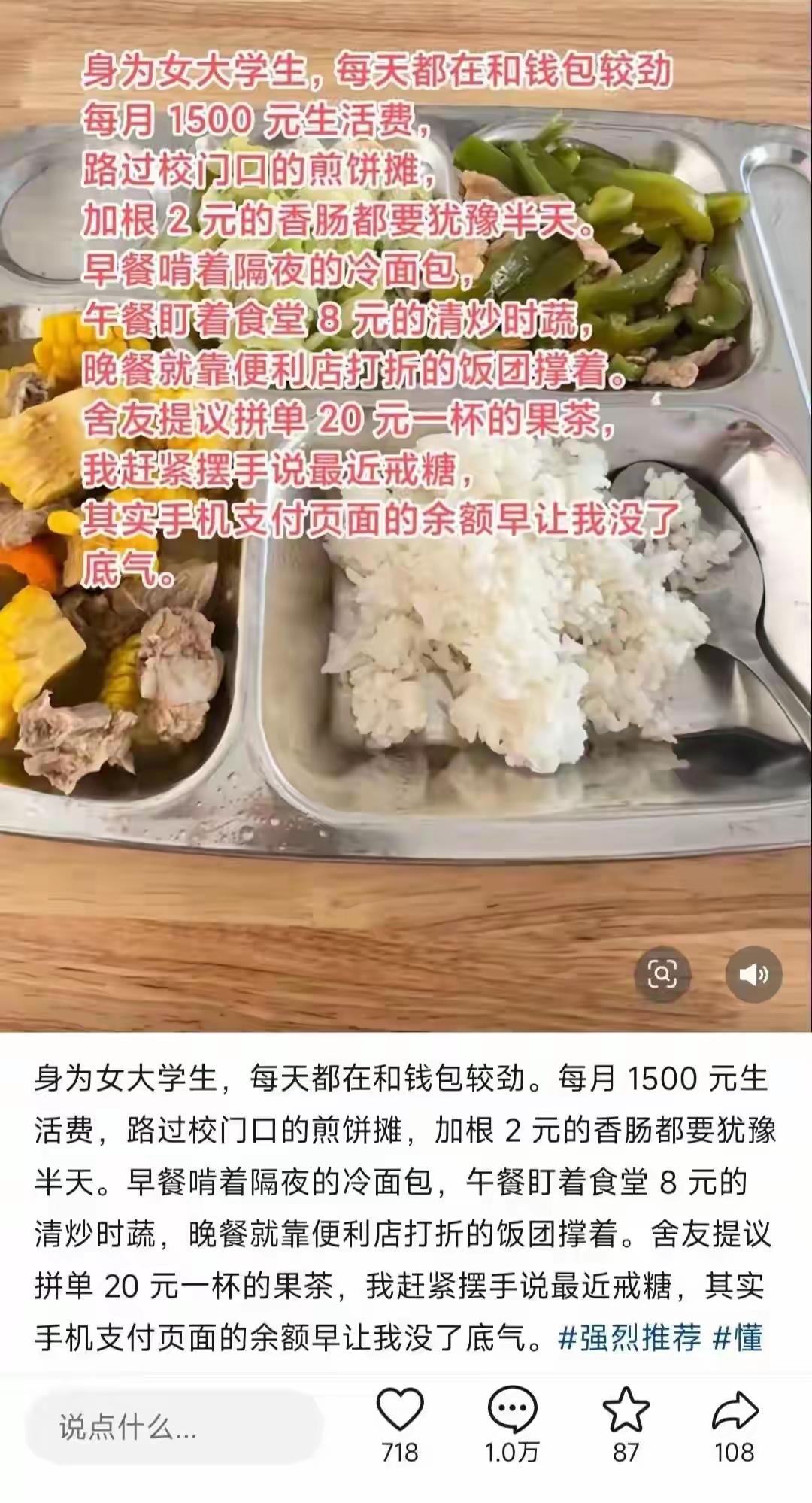 大女学女生哭诉每月1500的生活费不够 早中晚餐1080元,水果零食400元,奶茶120元,化妆品200元,衣服300元,其他费用100元。 如果有钱人家这个标准不过分,如果不是,1500足够,衣服可以省去,化妆品省去,用点大包一个月20足够,奶茶不喝。零食水果一个月100足够。 你要知道你的父母一个月挣几个1500,家里要不要开销,还有没有兄弟姐妹。不是只想着自己,等你出来就知道挣钱不容易,特别年纪大了更不容易。,一个月给1500就已经不错了,父母能给的是你的温饱问题,要打扮自己出社会挣钱打扮。 很多父母一年不知道舍不舍得给自己买400的水果,300的衣服,这姑娘是一个月就这么多了 大学4年每年在校9个月,每月4周,4×9×4=144,四年最低要买144件衣服!水果零食当饭吃的吗?一周要花100,苹果好一点的算8元一斤,一周12.5斤,一天吃两斤?难道是天天吃榴莲?奶茶都是智商税,还不如买水果吃!上学期间还要花妆,清清爽爽的,不行?