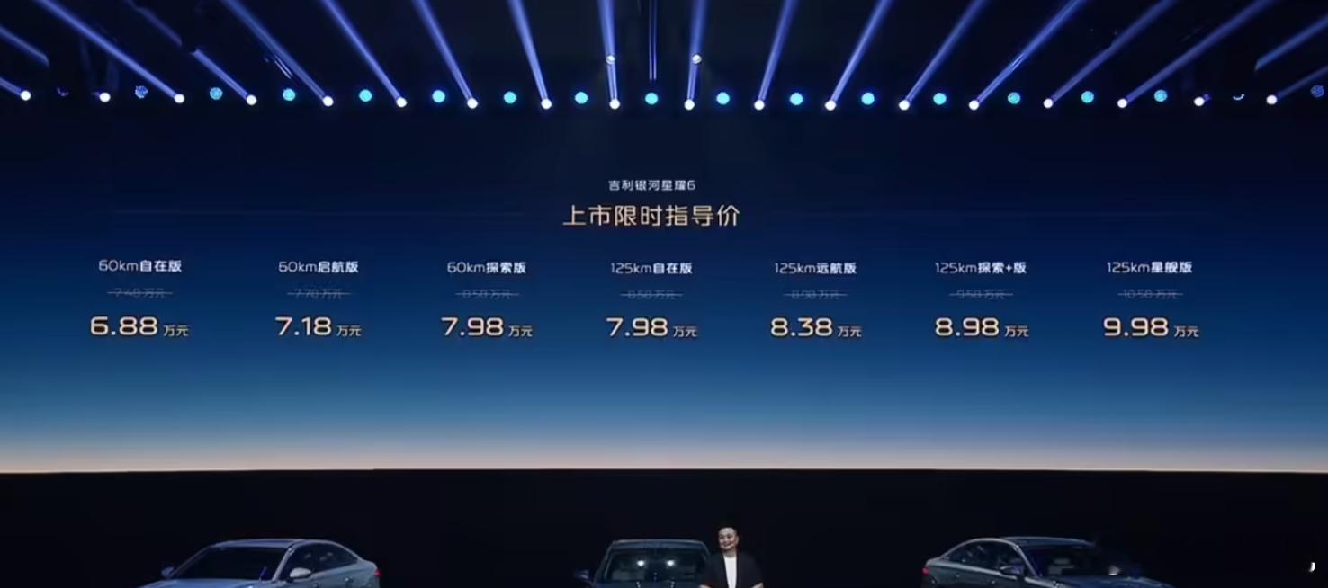 吉利银河星耀 6 限时 6.88 万起,插混,顶配有高快辅助驾驶,省油经济实用没毛病,压力给到比亚迪那边了......