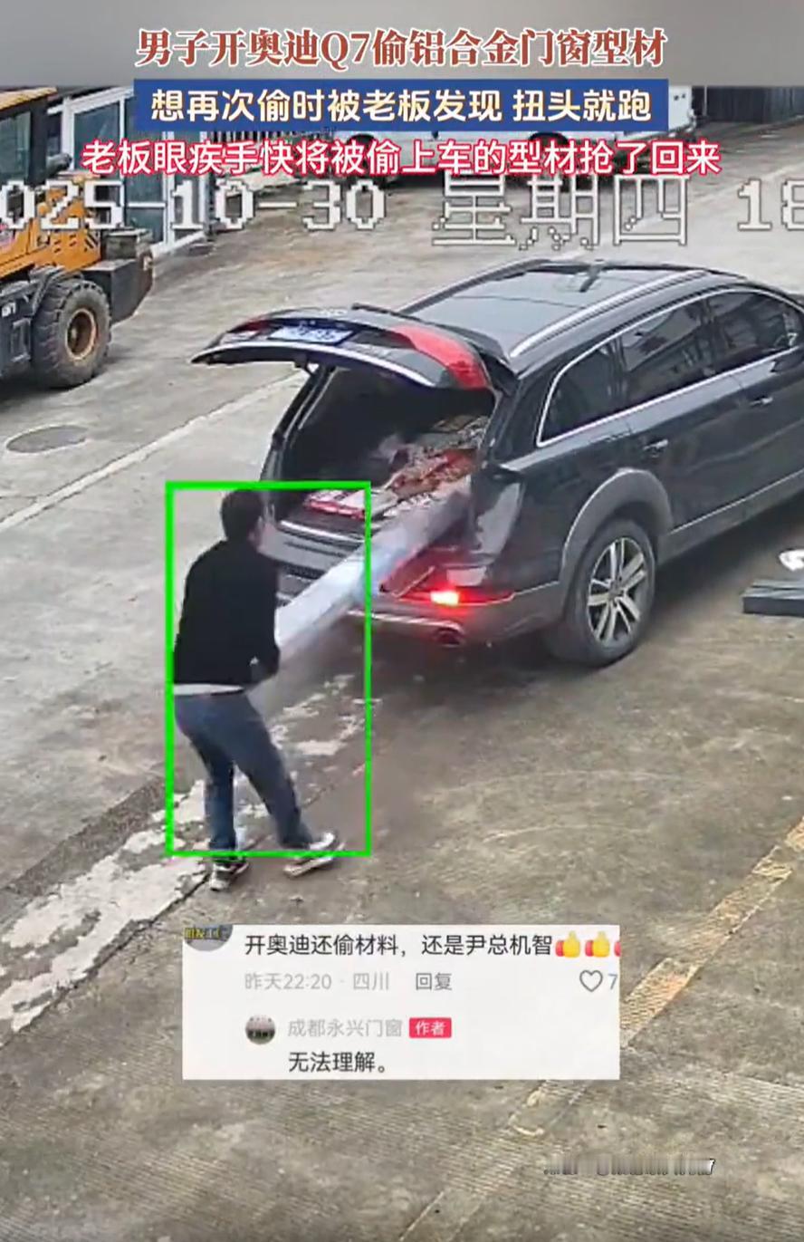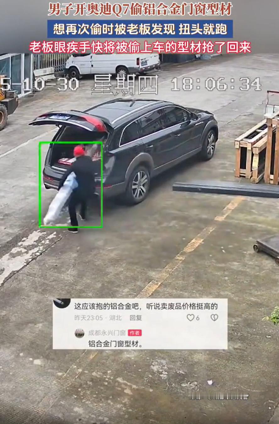 “这么有钱还干这个?”四川成都,一老板将店里的铝合金门窗型材放到店门口,听到动静出来查看,竟然发现一名男子正在偷偷的往车上搬,老板眼疾手快把材料抢了回来,可让人不解的是,偷材料的男子,竟然是开着奥迪Q7来的! 监控显示,男子开着一辆黑色奥迪Q7来到店门口,按一般人的想法,这可能是来客人进货订单的,可下车的男子却带着口罩,在门口东张西望,见门口没人,二话不说就把地上的铝合金材料装进了后备箱 第一次得手后,他并没开车离开,反倒还想继续搬,可这时老板听到动静走出来查看,男子转身就要上车离开,而老板也是反应迅速,赶紧把后备箱里的材料抢了回来 有网友调侃说:还得是Q7,一般车还真放不下! 当然,调侃归调侃,男子这一系列行为,确实让人摸不到头脑,一方面自己开着豪车,怎么看都不像是缺钱要偷东西的身份。另一方面,现在满大街的监控,难道就不怕别人顺着车牌号找到他吗? 由此可见,我们常常习惯于用单一标签去定义一个人——有钱人、穷人、好人、坏人,但真实的人性远比这些标签复杂得多 而对于商家来说,这起事件是个提醒:无论店铺位于什么地段,无论来客开着什么车,基本的防范意识都不能松懈。贵重物品应当妥善存放,监控设备需要保持正常运行,邻里之间最好能互相照应