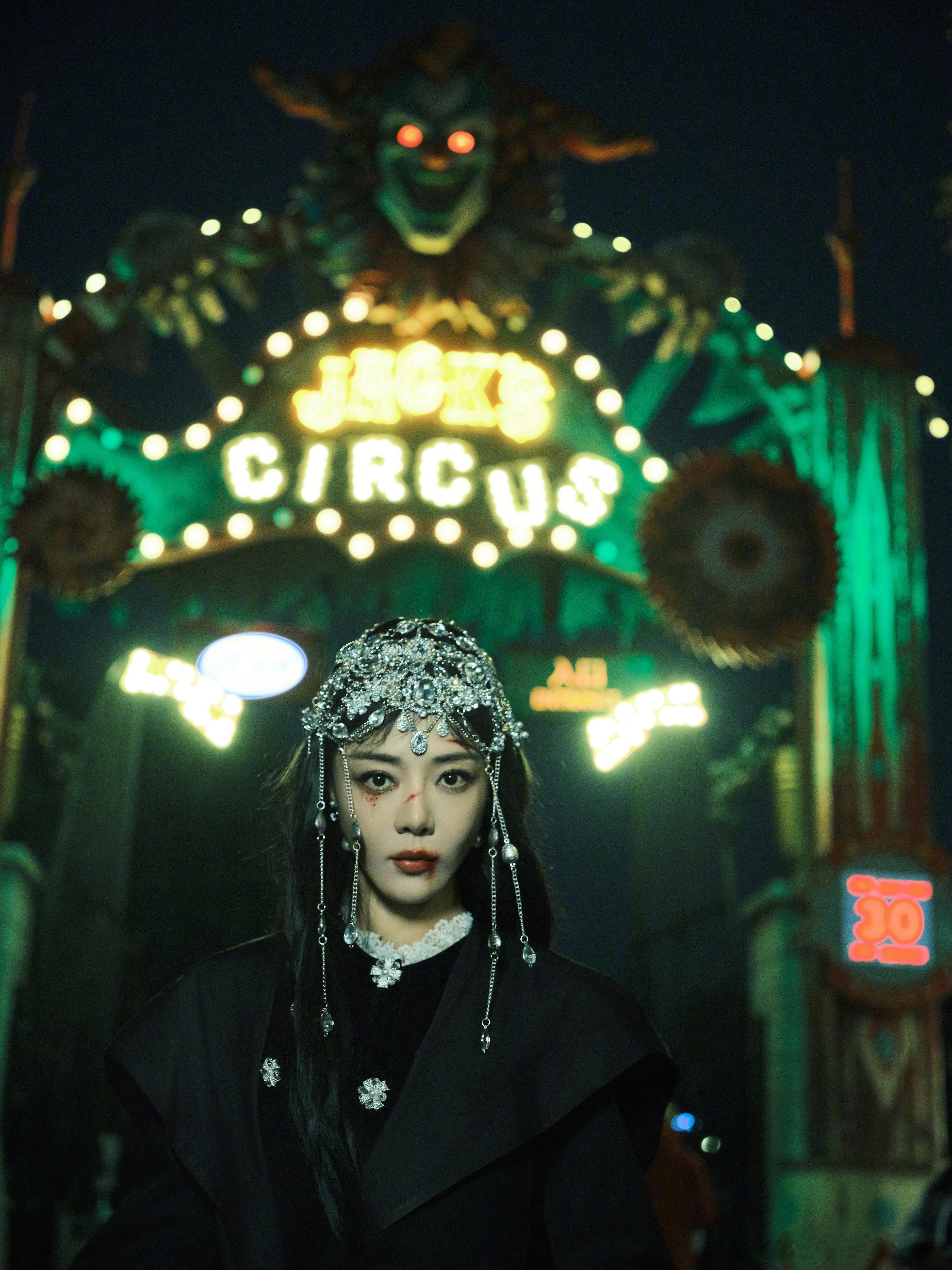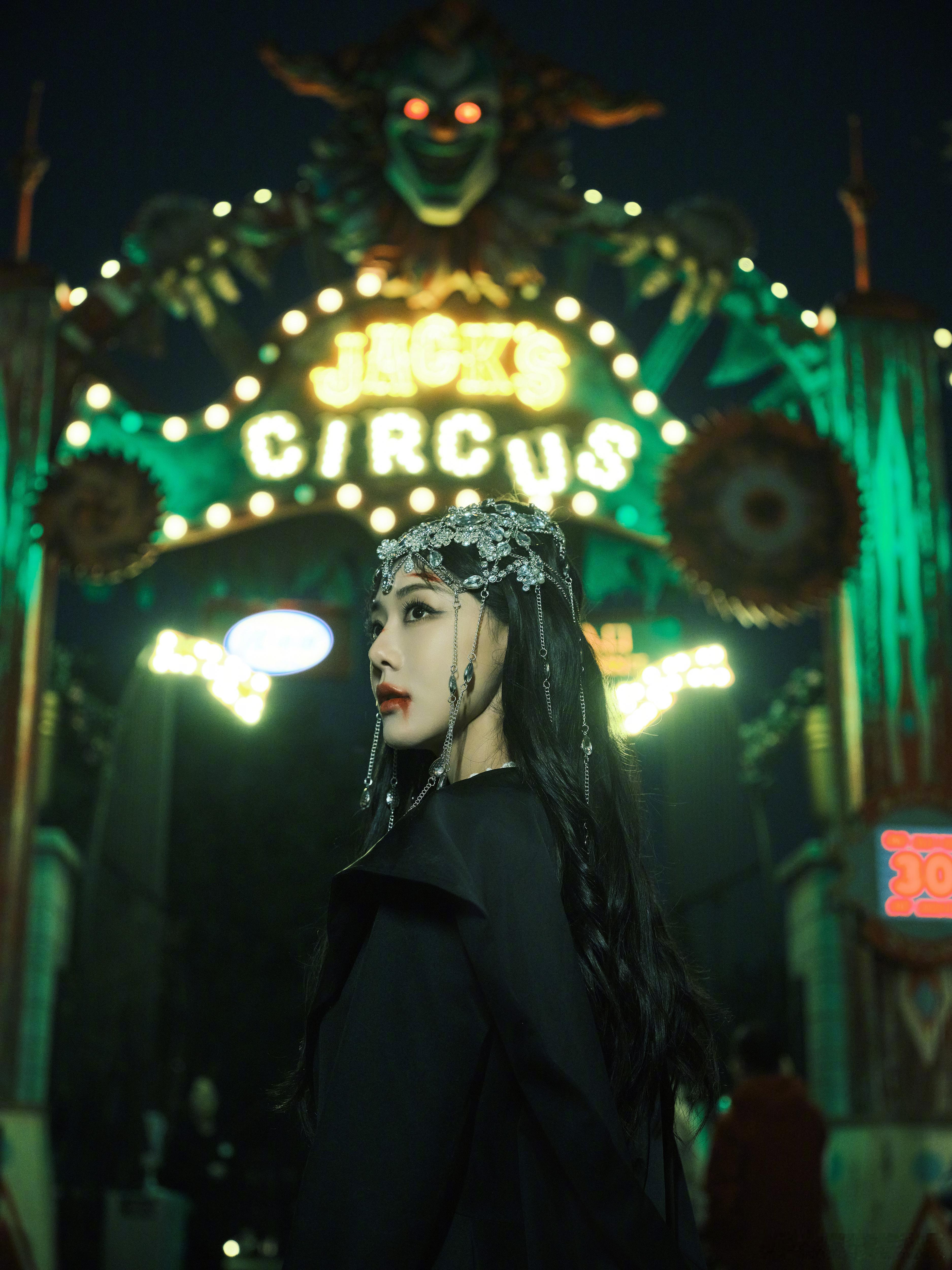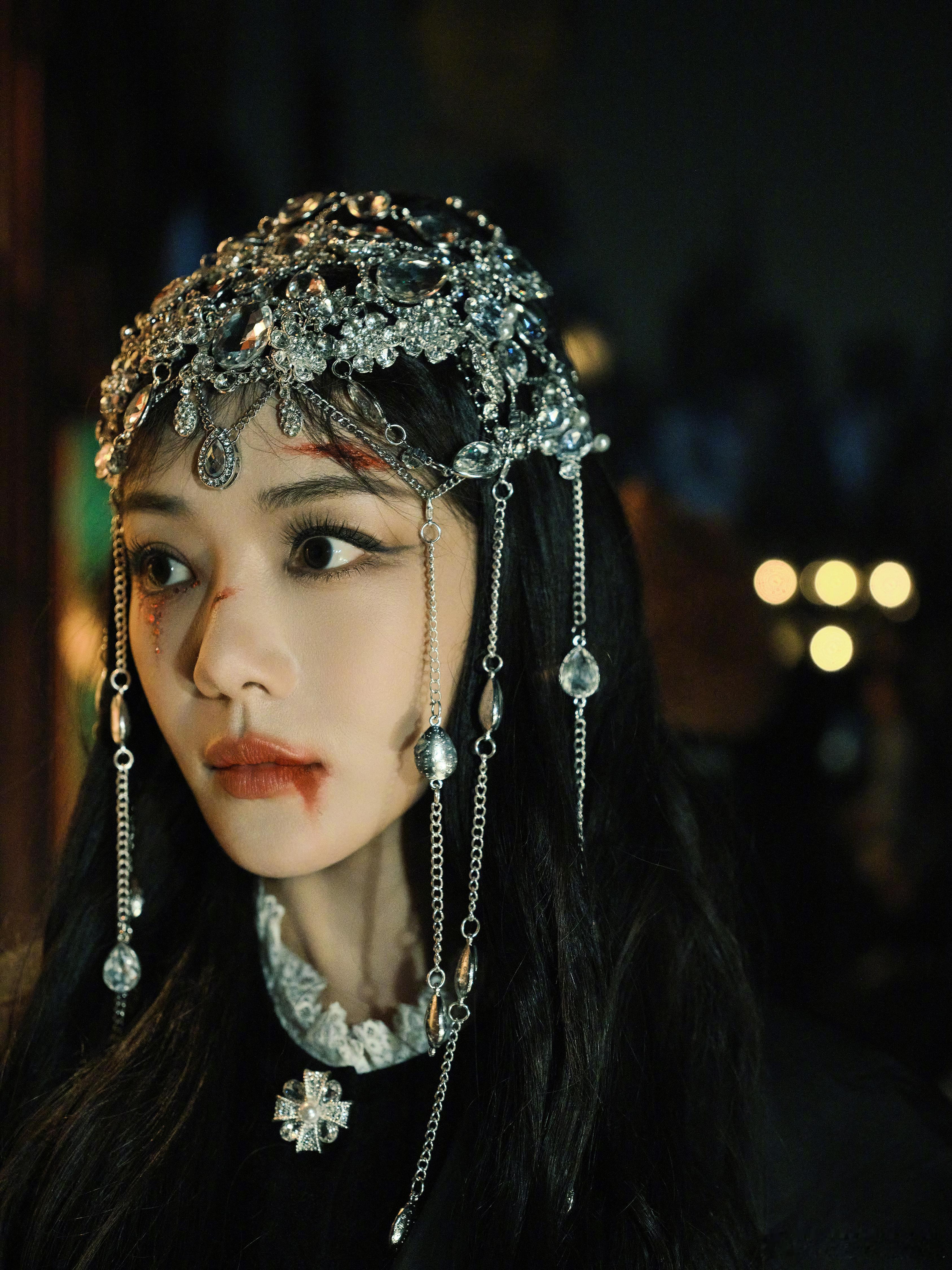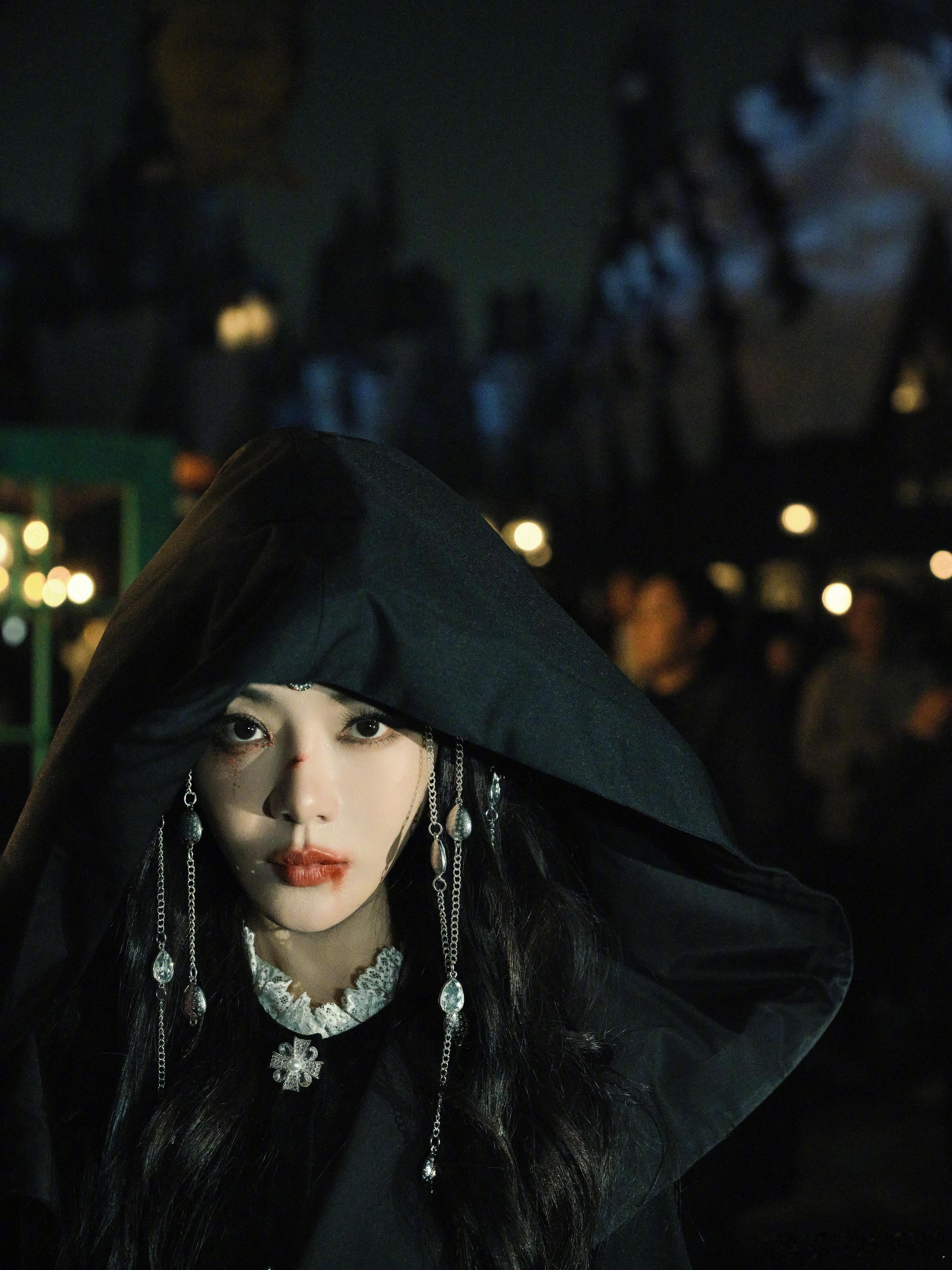 邓家佳cos暗黑女巫 万圣节变装杀疯了!黑袍斗篷+银饰链条头饰,血妆自带疯批美感,暗黑女巫氛围感直接拉满~