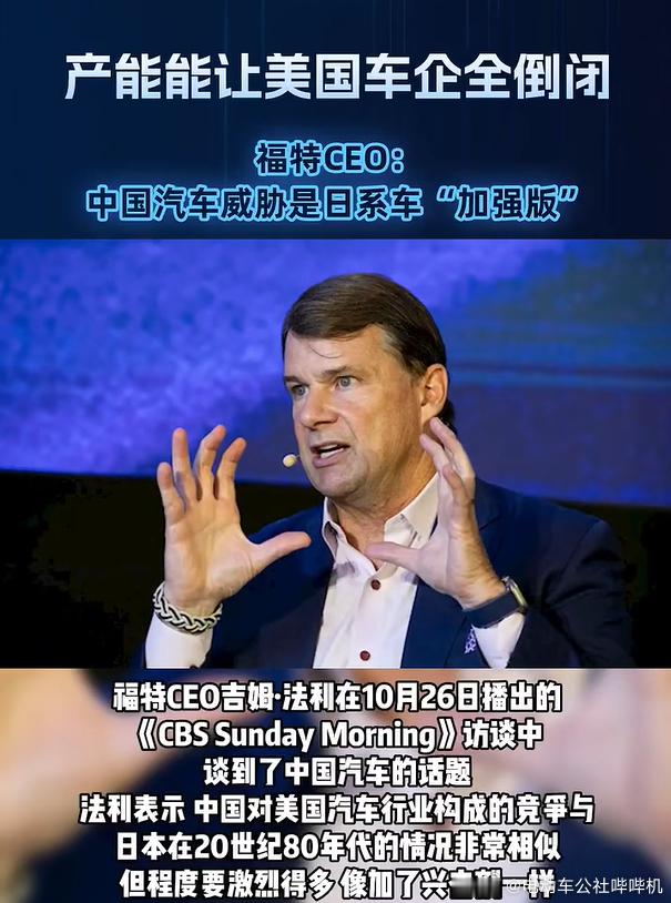 福特CEO称中国汽车威胁是加强版 曾经的80年代,日本汽车工业席卷全球,迅速占领各国市场,甚至成为一种“精神堡垒”。