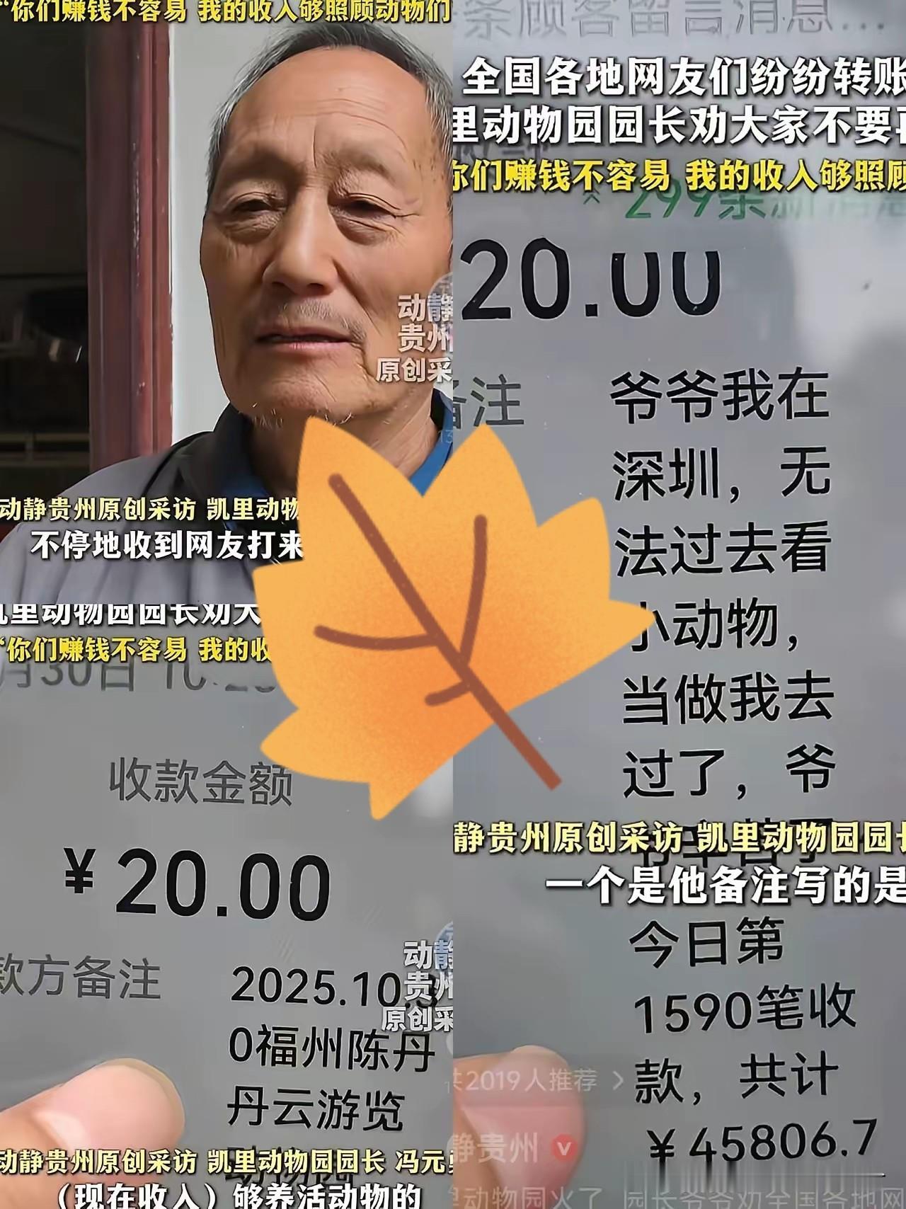 凯里动物园的园长走红了。 k因为他对动物的细心照料,因为他门票只收20元。70多岁的园长和老伴,经营了十几年这个动物园,从来没有盈利过,都是两老用自己的退休金在补贴。没想到一段视频被大家看到了,网友们纷纷转账20元给这个可爱的老园长。 园长很感动,但他还是呼吁大家不要转账了,他说我们已经够了,我们会好好的照顾这些动物,大家赚钱不易,你们要把钱花在该花的地方。 你说这样的园长值得不值得我们去支持,光门票只收20元,谁能做到?这样的园长,值得我们每一个人去支持。