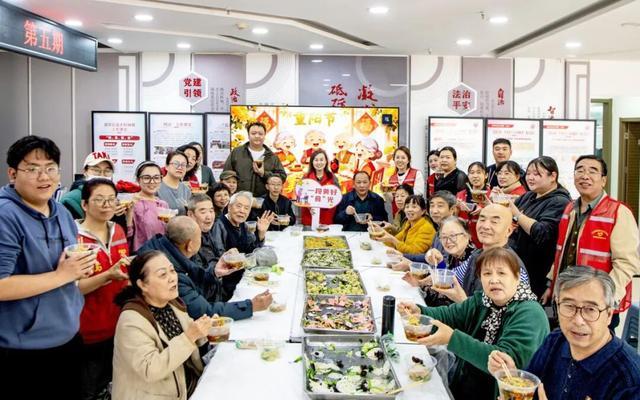 最动人的莫过于“一段美好食光”百家宴环节。志愿者们提前采购新鲜食材,精心烹制出一道道家常美味——爽口的凉拌菜、筋道的拉面……这些热气腾腾的饭菜被细心端到老人面前,大家围坐共餐,聊着家常、笑着举杯,热闹的氛围驱散了秋日的微凉。