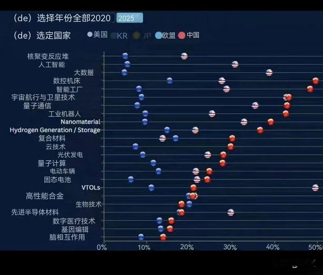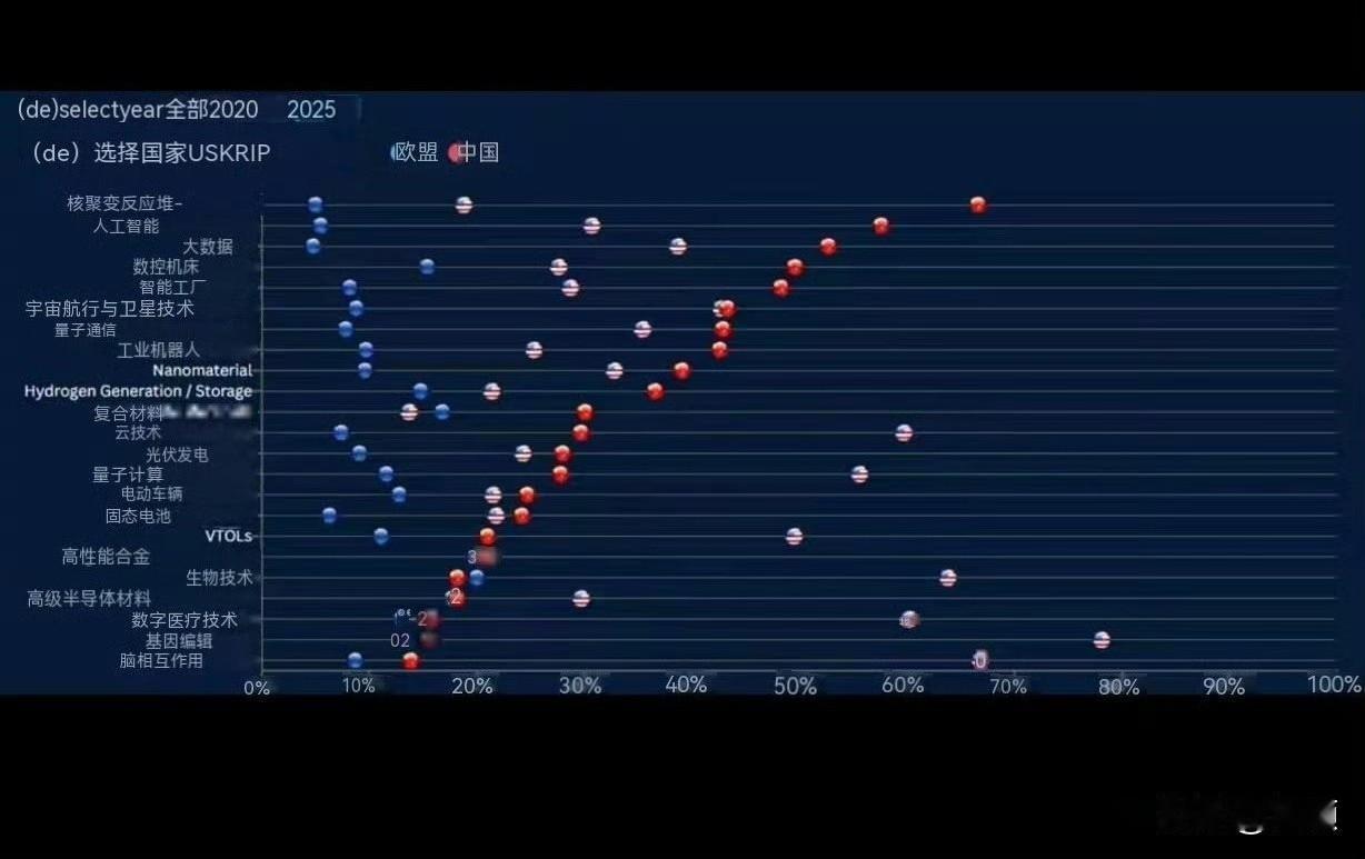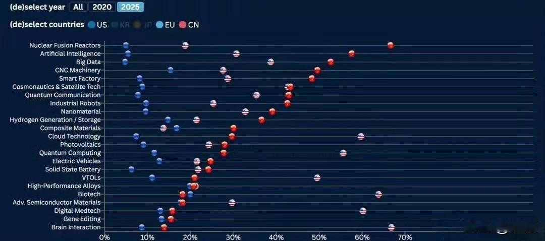 近日,德国专利机构Econsight对中国“十五五”规划进行分析,从各国在不同技术领域申请的世界级专利占该领域全部专利的比例角度,展示了中美欧三方在多个技术领域的专利情况。 总体来看,中国在所列举的23个技术领域全部取得了进步,专利占比均有提高,而美国和欧洲都有一些领域的专利占比下降。中国领先程度最大的领域是可控核聚变,其次是人工智能和大数据,还有数控机床和智能工厂等,这些领域体现了中国作为制造业强国的关注点。在宇宙航行与卫星技术方面,中美专利数量几乎一样,欧洲则远远落后。 美国领先程度最大的领域是基因编辑,其次是生物技术和脑相互作用,另外数字医疗技术、云技术、量子计算等也遥遥领先。这些领域对制造要求较低,体现了美国科学发展的高精尖特色。 此外,专利领先并不完全等于产业领先,例如在电动汽车领域,中国的产业规模领先巨大,但中美的专利数量差距不大。 难怪德国总理默茨发出“不能让美中两国单独决定科技的未来” 这样的哀叹。
