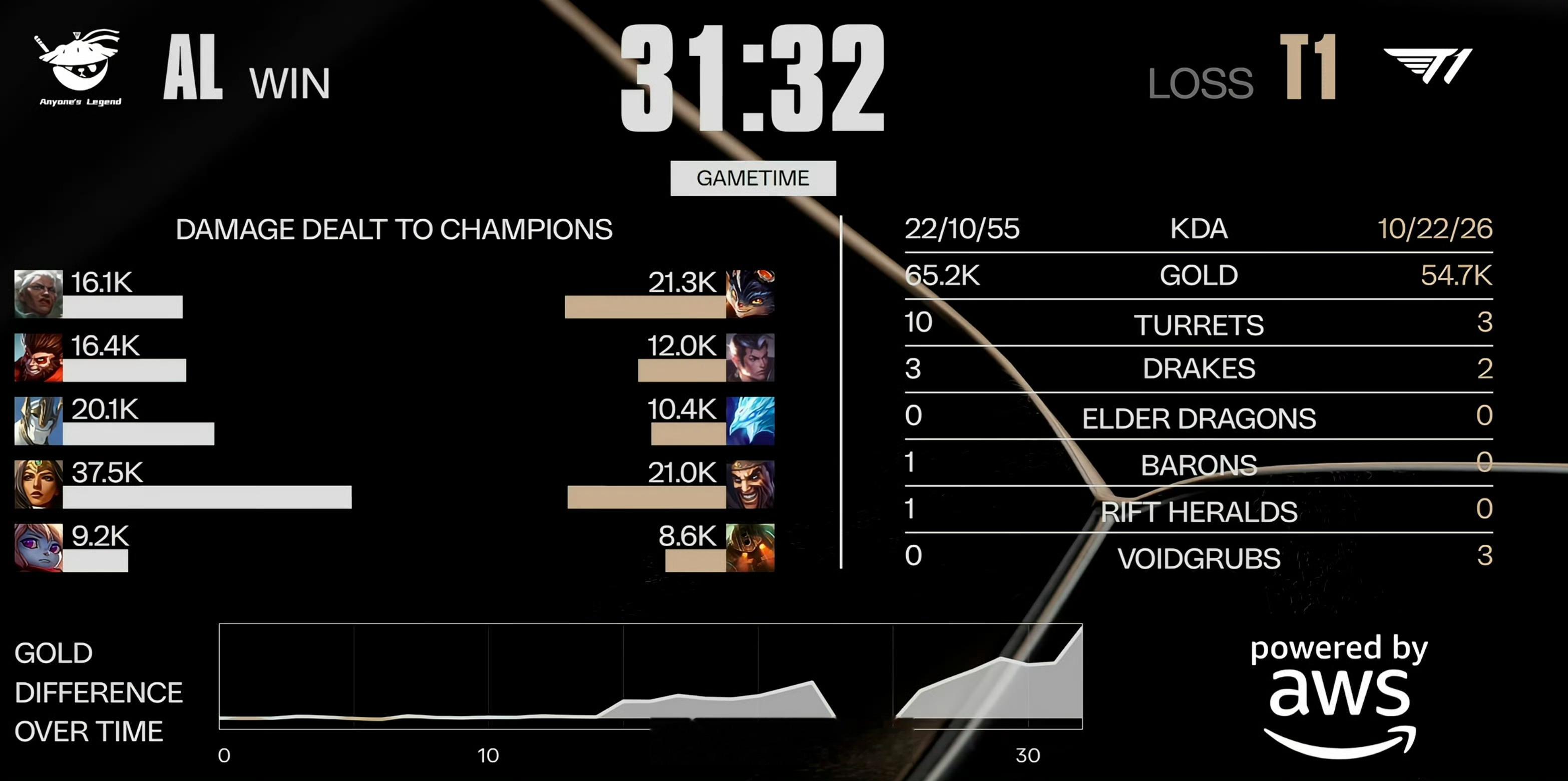 【AL 1-1 T1】阵容压制,AL打团毫无压力,中期给了个零换五让人虚惊一场,T1众人这局是失误频频轮番开送,两边的比分来到一比一!!