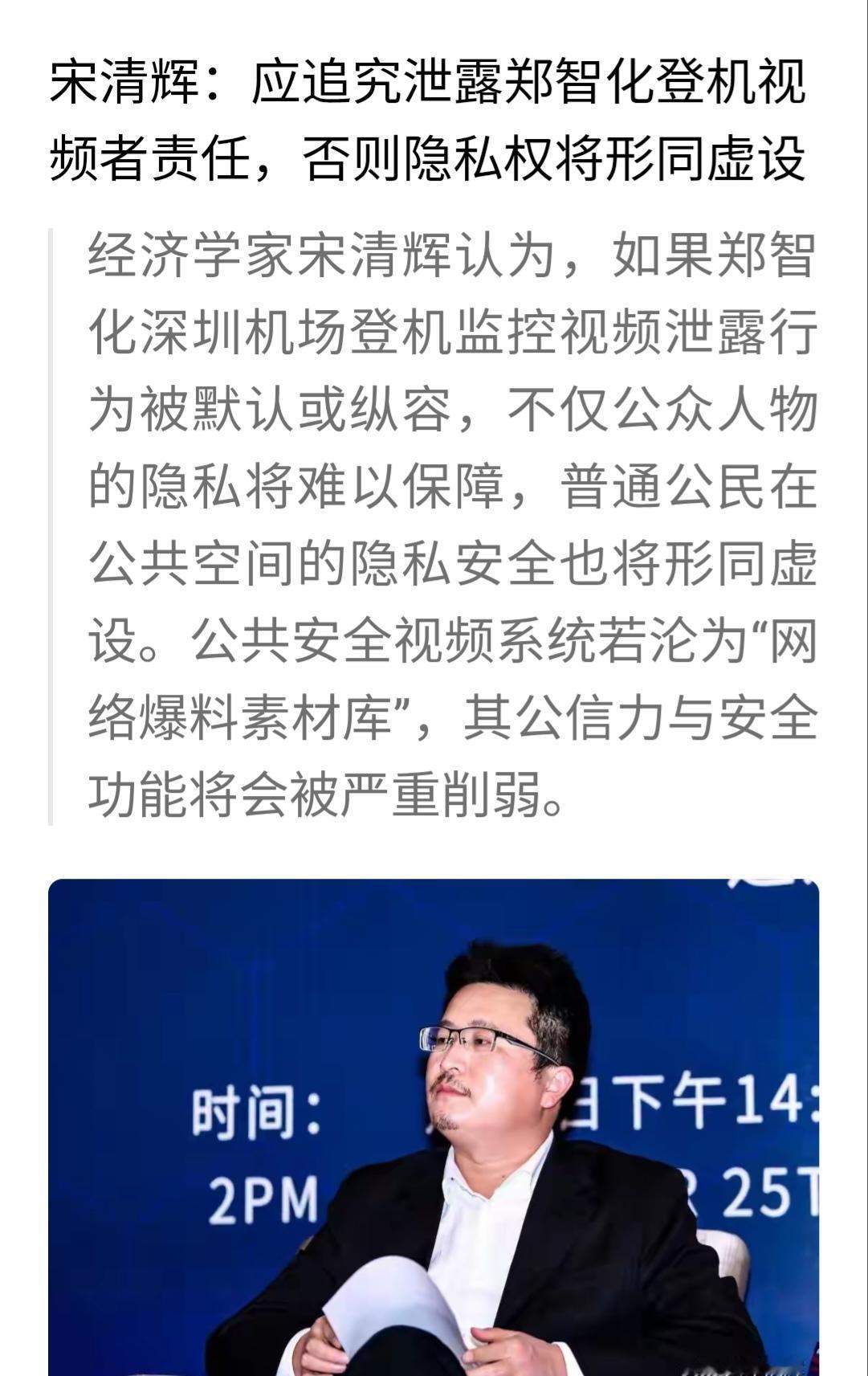宋清辉:应追究泄露郑智化登机视频者责任,否则隐私权将形同虚设。 近日,经济学家宋清辉认为:“应追究泄露郑智化登机视频者责任,否则隐私权将形同虚设。公共安全视频系统若沦为“网络爆料材库”,其公信力与安全功能将严重削弱…”。 如果光从表面看这种主张似乎有点道理,然而,任何事情必须先了解问题的根源后再去做判断应该会更加得出理性分析。 其实,网络上之所以公布视频可以说是起到还原事实的作用,这反而非常理性的行为。别忘了是“某明星”先指责机场管理不人道,让他“连滚带爬”。相信此时如果机场再多的语言去辩解,还不如一个当时视频更能让公众去明辩是非。从当事者迅速致歉看,已经达到此目的。 因此,从事情的前因后果看问题,此次公布视频个人看法并非有什么不妥。