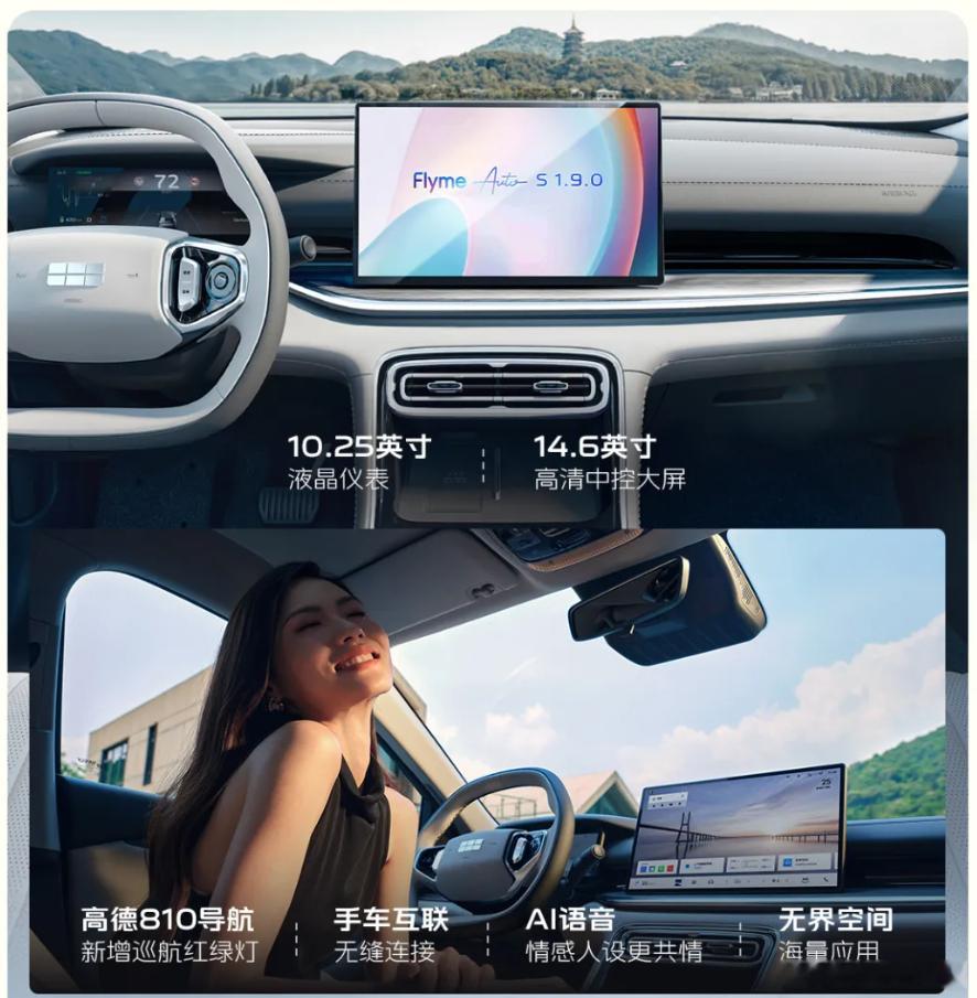 内饰方面,提供14.6英寸悬浮式中控屏与10.2英寸全液晶仪表盘,配备Flyme Auto车机,整体看上去极具高档质感。车机还将配备7nm龍鹰一号自研车规级芯片,内存+存储规格为16G+128G,GPU算力900G FLOPS,CPU算力100K DMIPS,NPU算力8 TOPS。