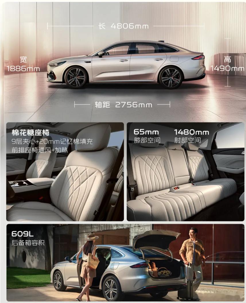 车身尺寸为4806/1886/1490mm,轴距为2756mm,定位A+级轿车。
