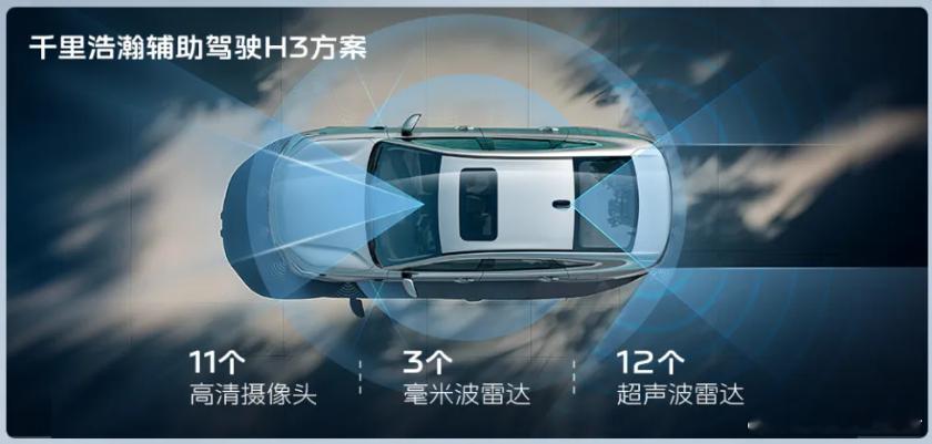 辅助驾驶方面,新车千里浩瀚H3安全辅助驾驶系统,硬件包括11个高清摄像头、3个毫米波雷达和地平线征程J6M芯片,拥有128TOPS算力,虽未提供激光雷达版本,但系统支持APA全场景自动泊车辅助、NOA城市通勤领航辅助等。