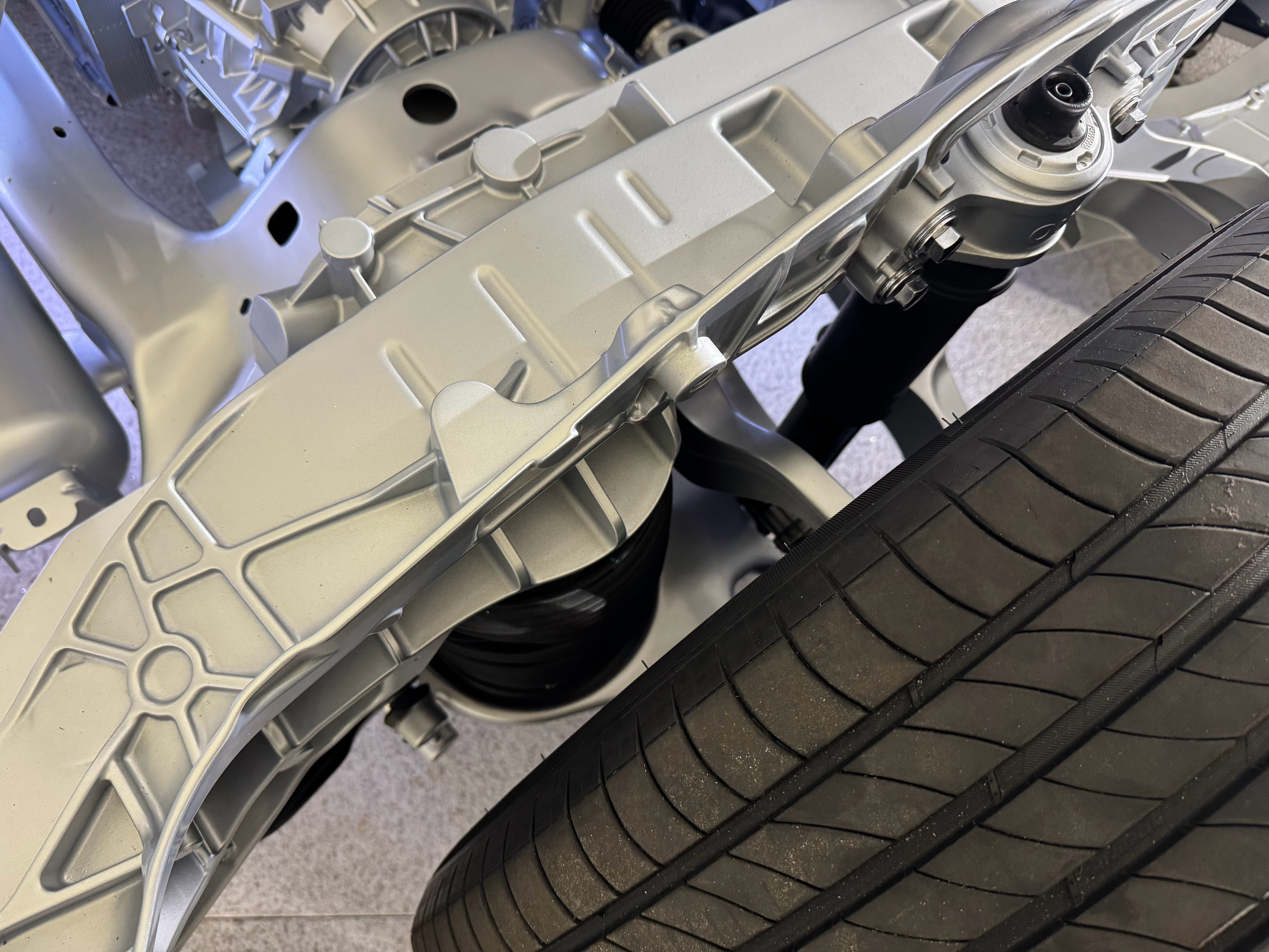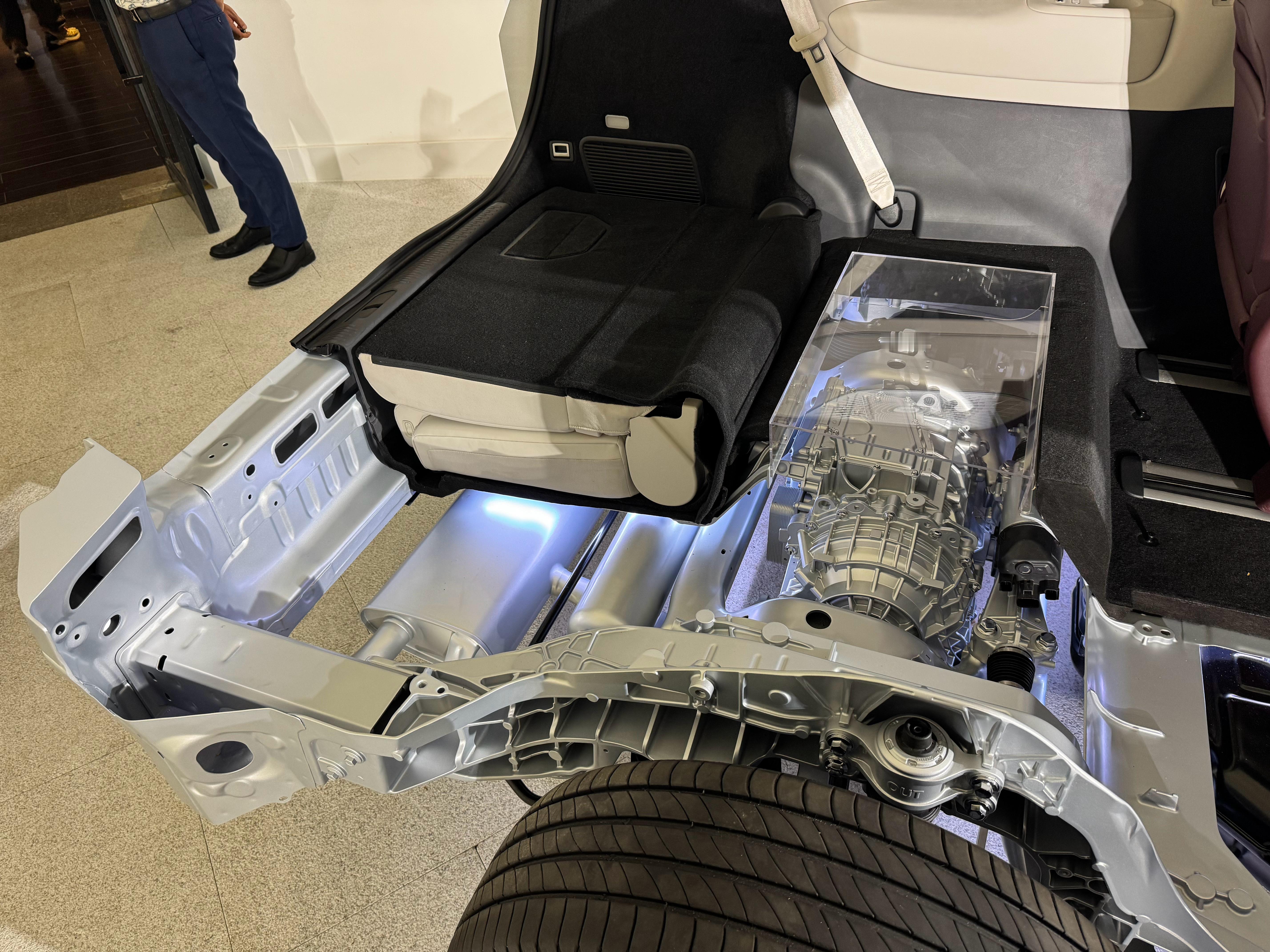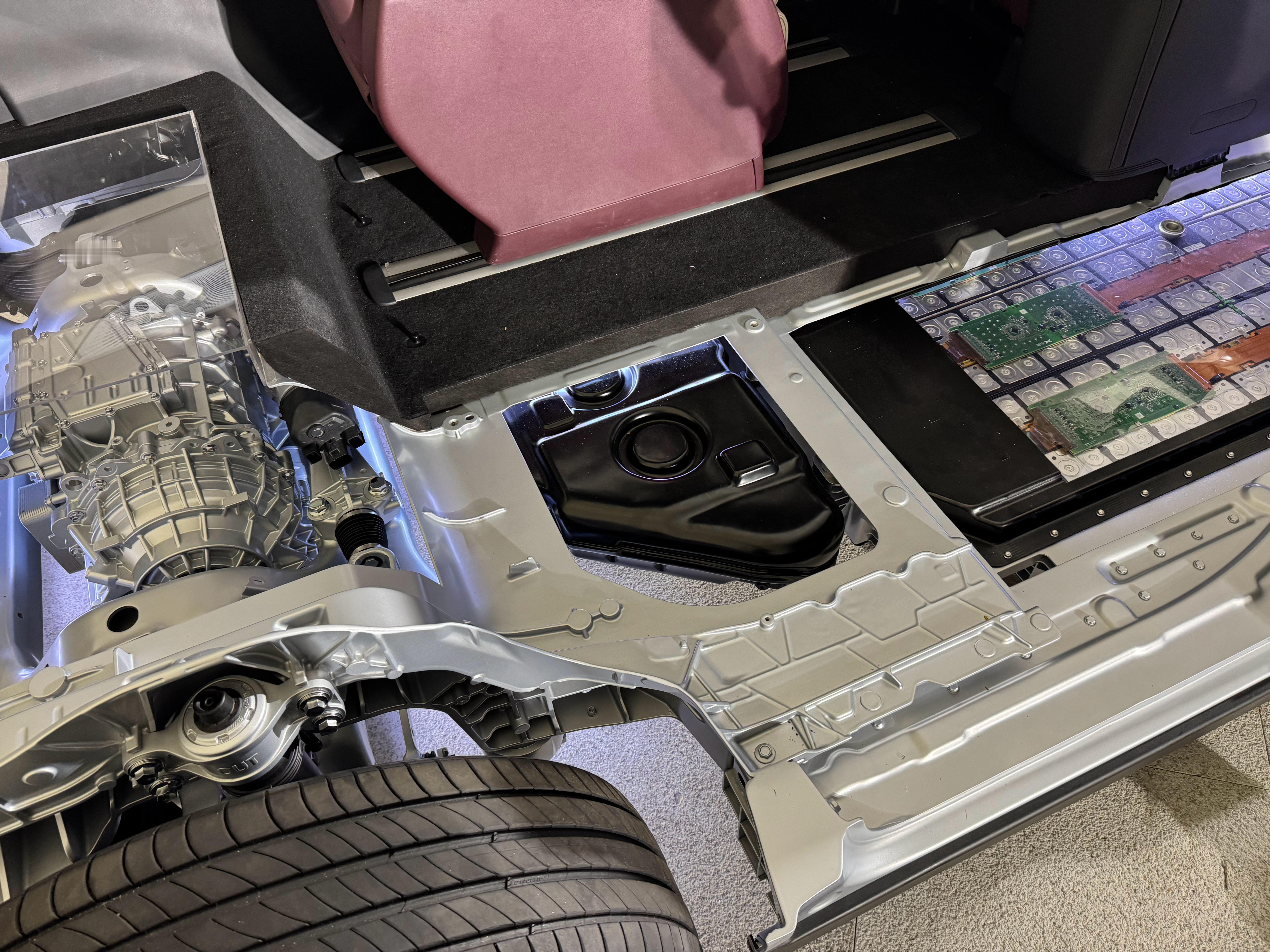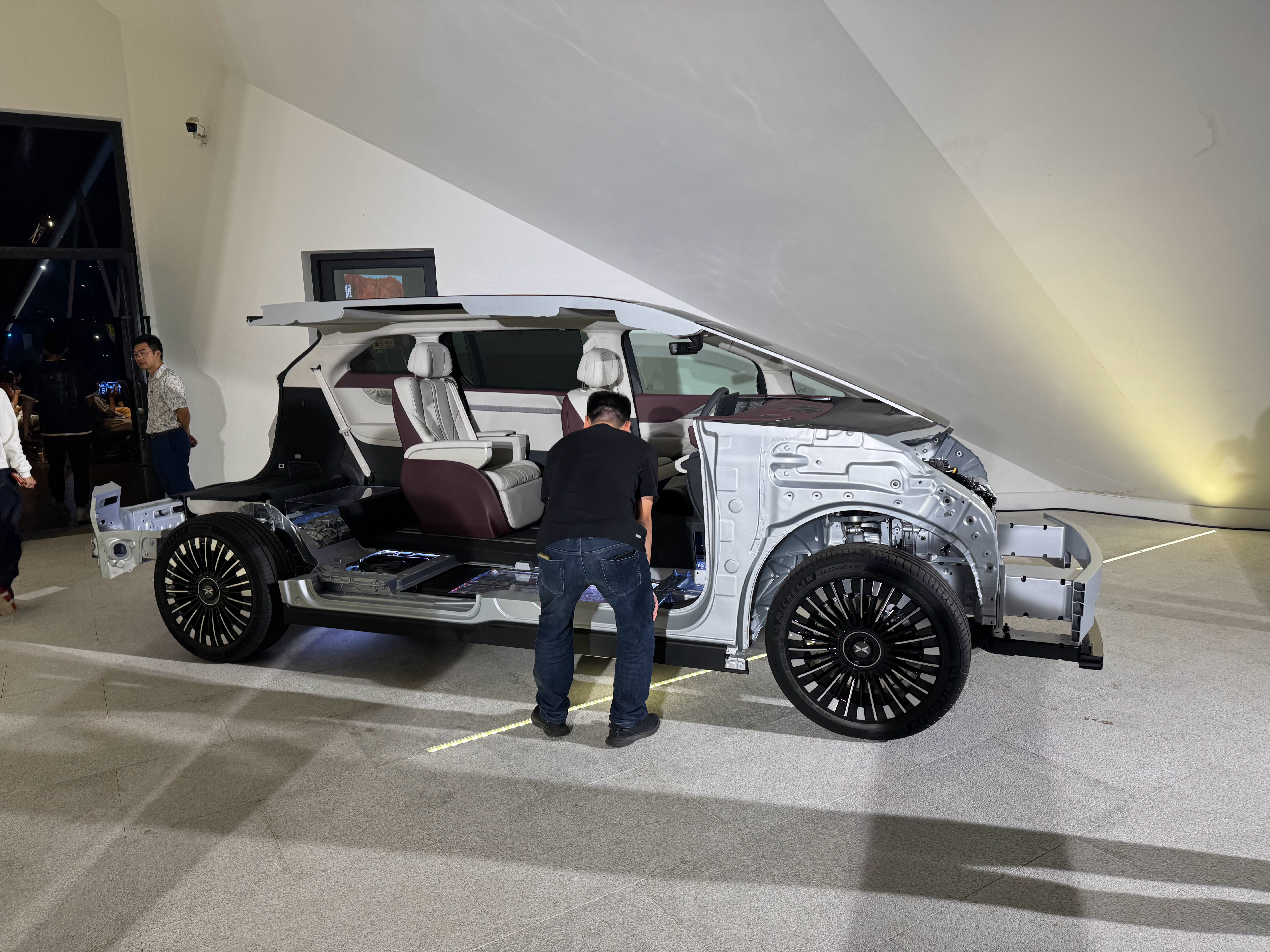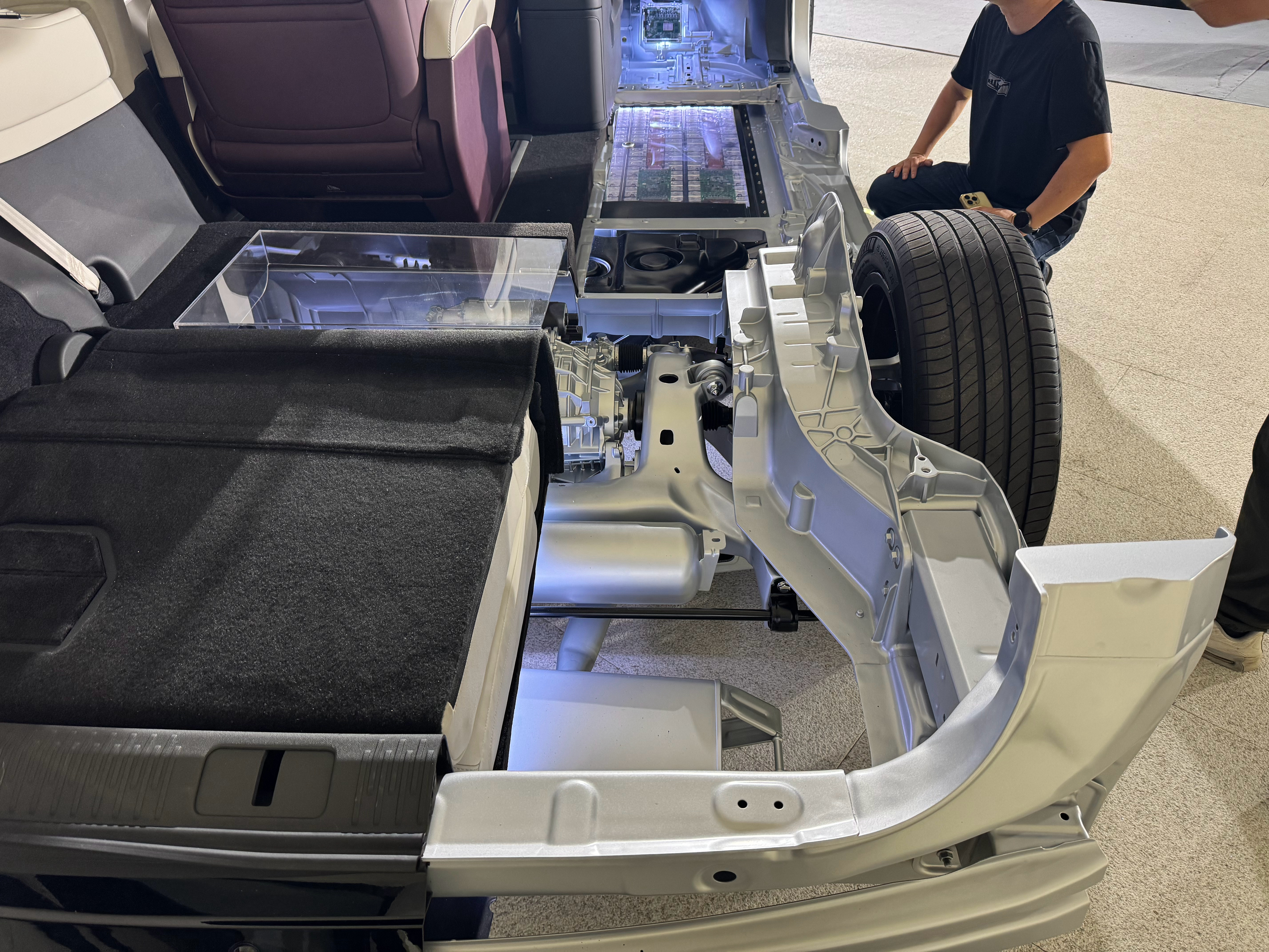 小鹏X9超级增程保留后轮转向小鹏X9把车身结构搬到了活动现场。展示了他们是怎么布