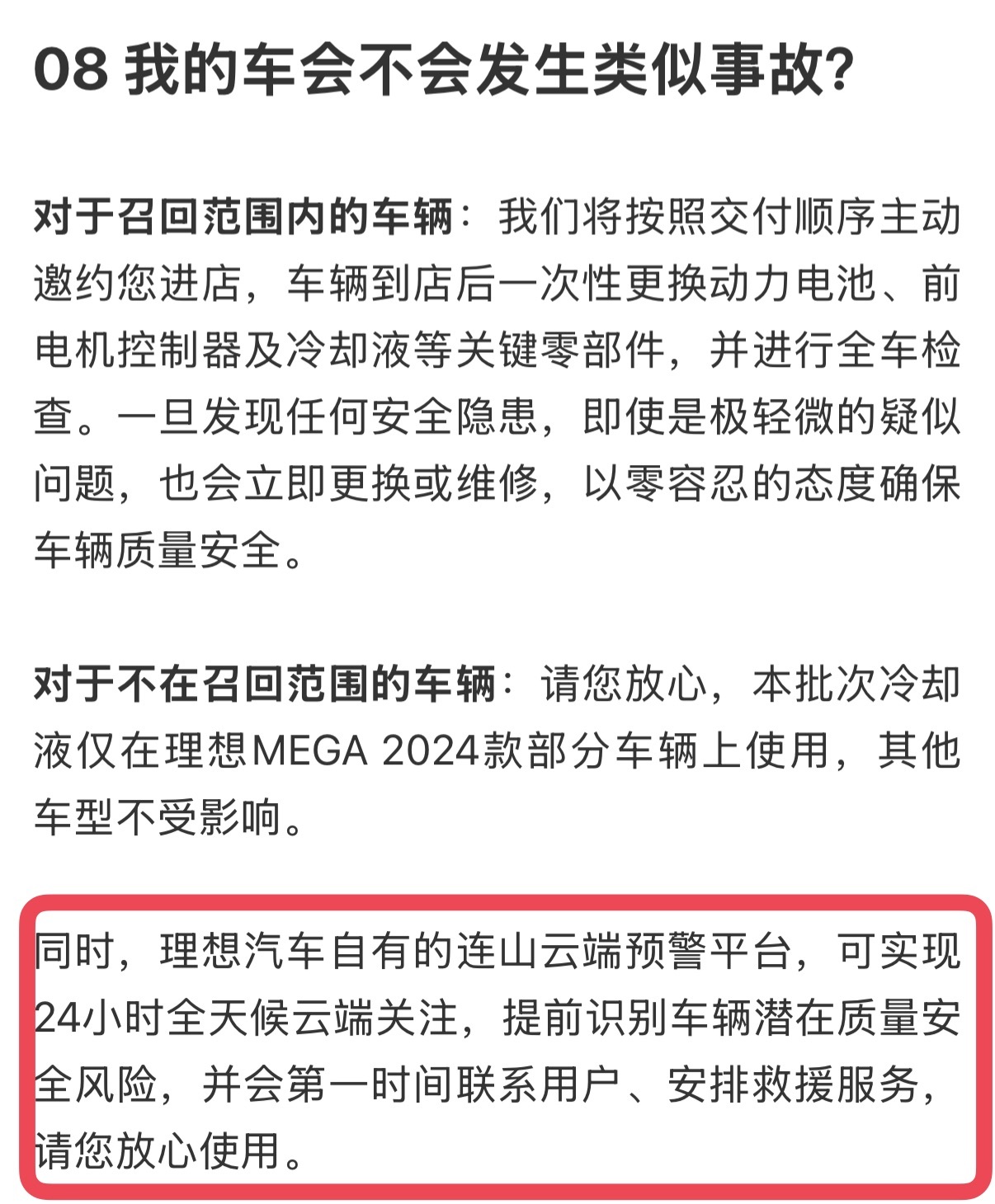 理想就车辆起火道歉针对前段时间理想MEGA自燃事件,官方回复了,由于该批次车辆冷却液防腐性能不足导致,并主动召回11424辆 2024 款理想MEGA!