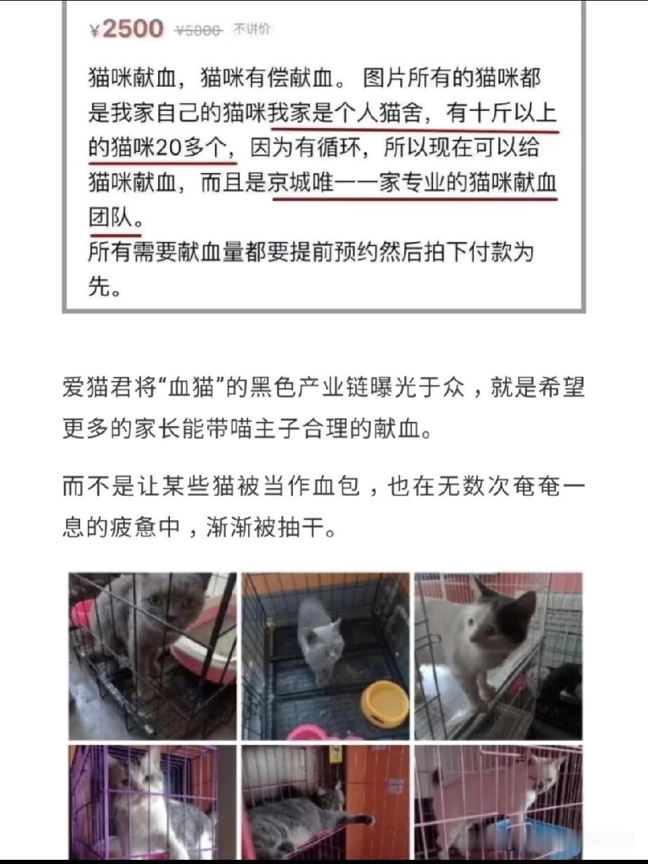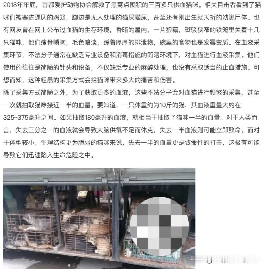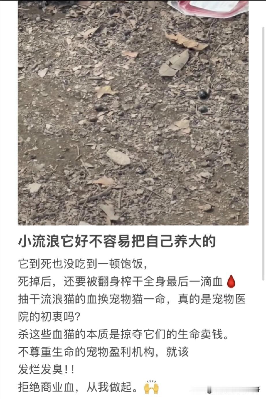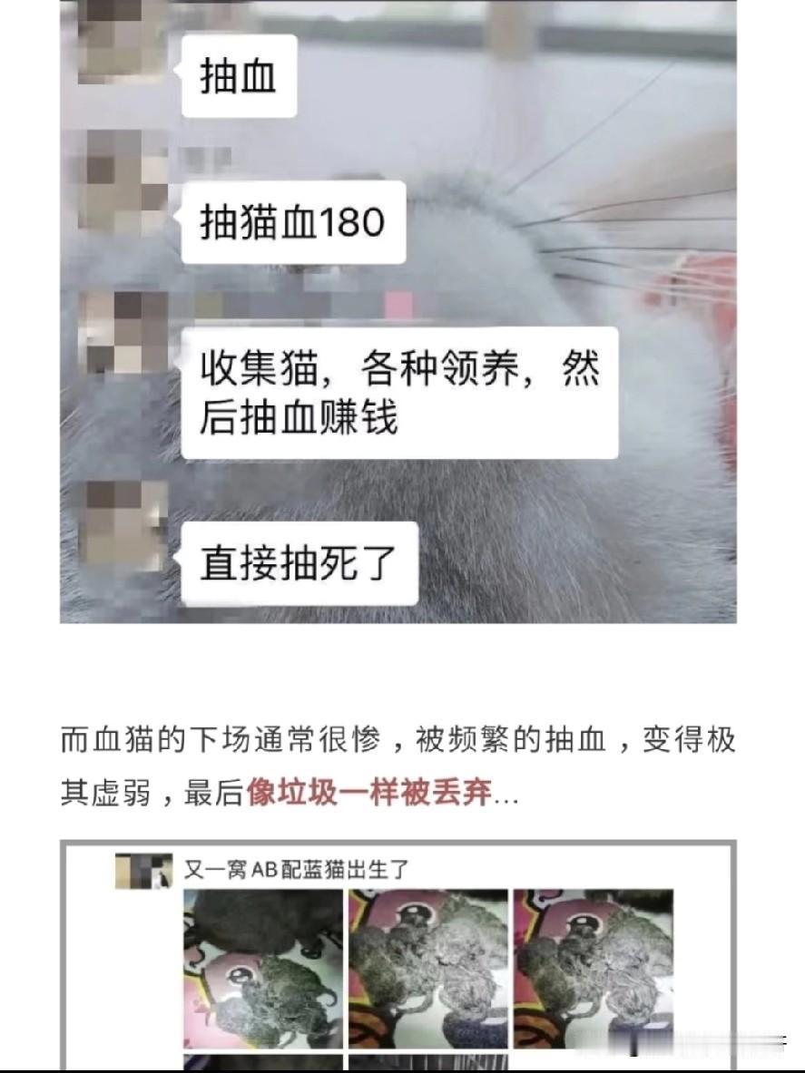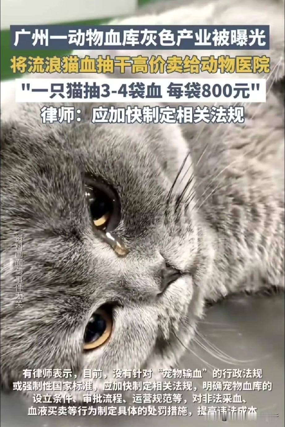 又一黑色产业链被扒! 刷到一条视频,一只流浪小猫被血贩子抽血,小猫浑身的血快抽干了,猫血贩子又把它的身体倒过来往下使劲倒了倒,希望榨干它身上最后一滴血。 据悉,一袋猫血大约可以卖800元,一只流浪猫可以抽3袋血,一只流浪猫猫血大概能卖2400元, 而这些血到了宠物医院就成了商业血,专门用来救治高贵的宠物猫。 (让我联想起余华小说《活着》里福贵的儿子有庆给校长妻子献血,却被医生抽血过多而去世了,好像底层人就和流浪猫一样,本来就过得很苦了,还要为宠物猫服务) 流浪猫好不容易给自己养了一身肉,准备暖呼呼过冬了。 可是它们甚至没有等到冬天来临,等来的却是死亡的恐惧。 可能对于大众来说会认为很普通的事,但是对于爱猫人士来说这是件特别残忍的暴行! 活着