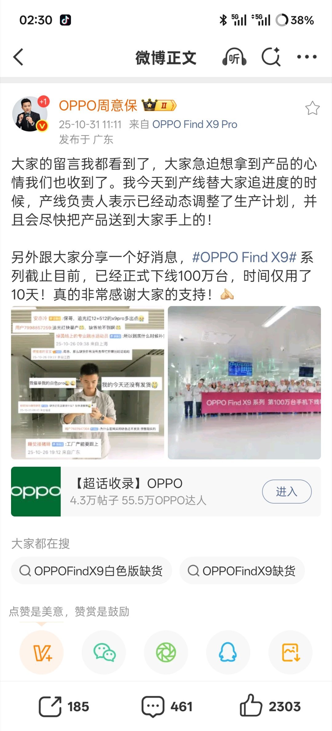 OPPO Find 系列产品负责人周意保在微博透露,OPPO Find X9 系列截至目前,已经正式下线 100 万台,时间仅用了 10 天。产线负责人表示已经动态调整了生产计划,并且会尽快把产品送到大家手上的。
