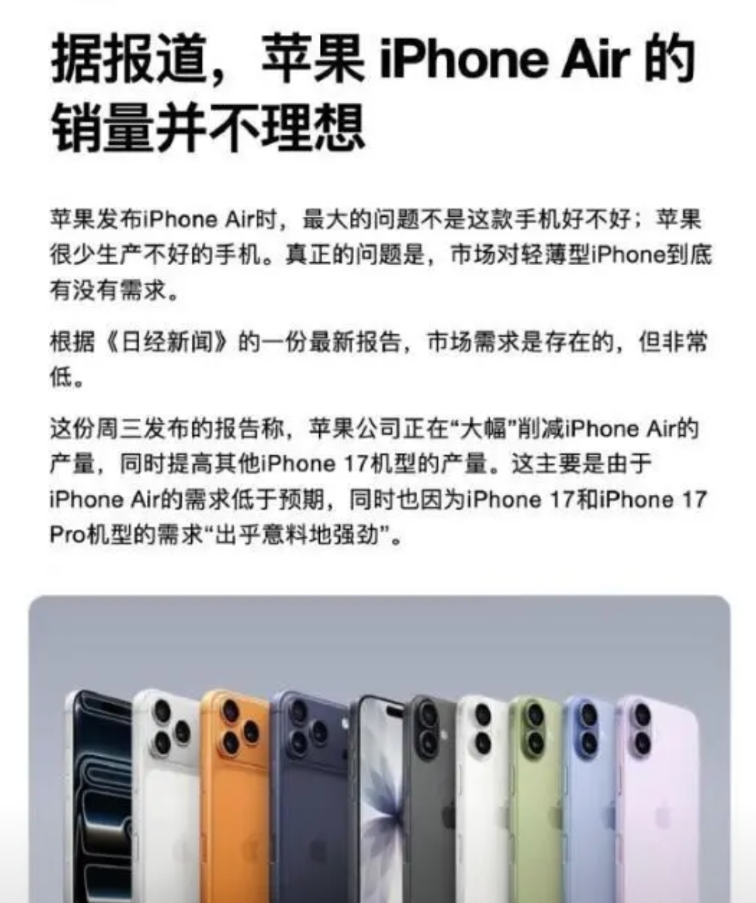 苹果叫停轻薄版Air,市场认可度不佳! 实际上,对于很多人而言,轻薄的确是选购手机时较为看重的因素,但它远远无法超越性能、系统流畅度、摄影以及续航等其他功能所带来的使用体验。 近期,华为也开始流出各种mate70 air,宣传语就是不止于薄,相信也是综合了一下市场对于Air机型的反馈。