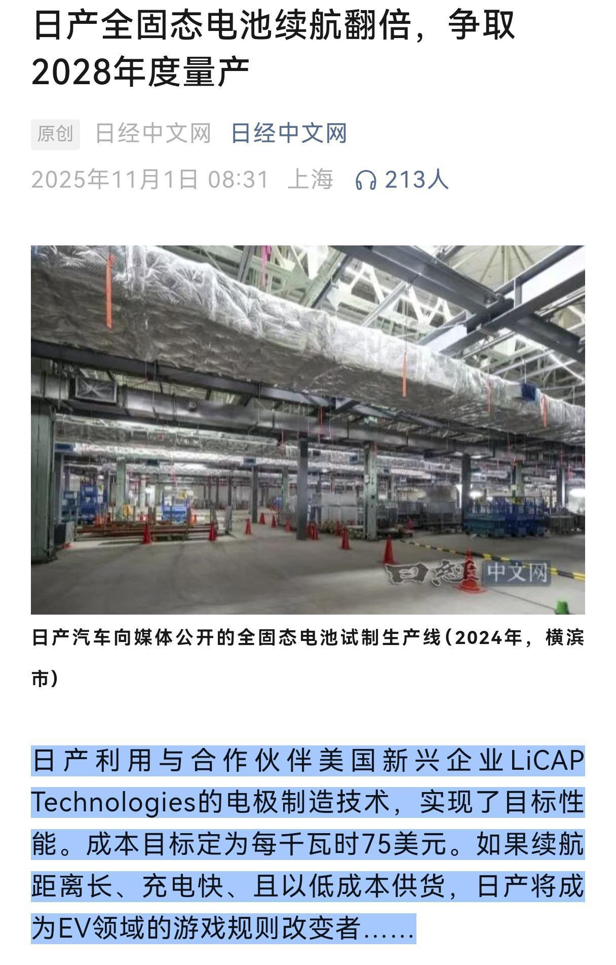 日经新闻网今天消息,日产全固态电池续航翻倍,争取2028年度量产。 看到这新闻,我只能说在电动车领域,日本确实已经落伍了。一个新技术,要三年后才能量产。可那时,可能中国早就研发出更先进的技术了。 只能说在发动机汽车时代,日本确实是领先的,但现在,已经有点跟不上了。